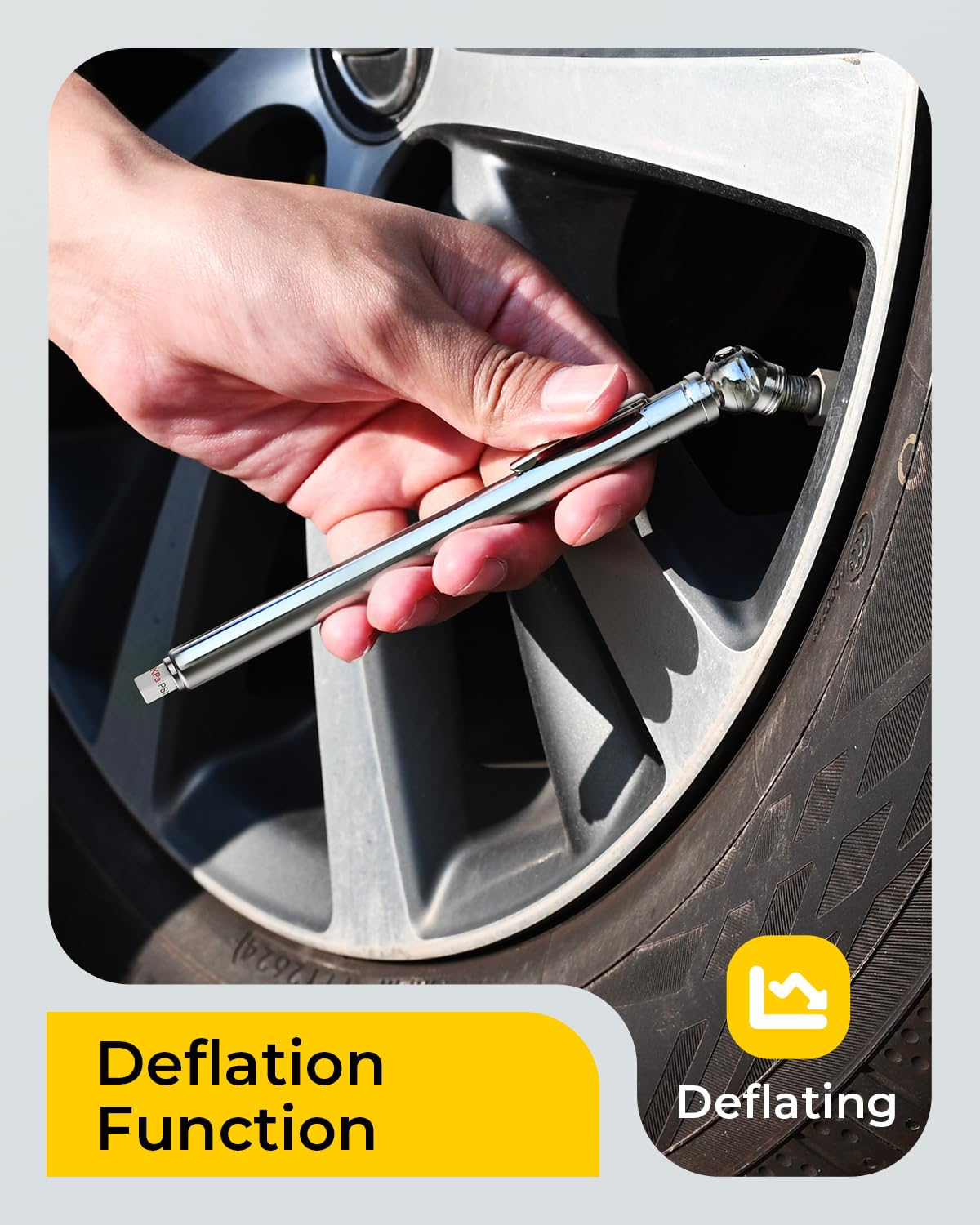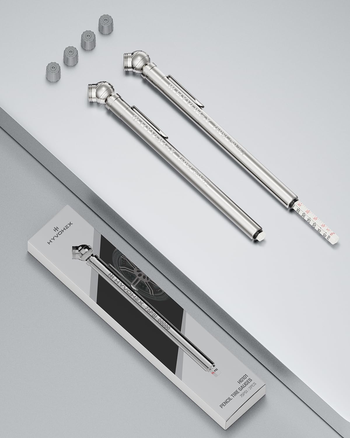 • Pocket-sized, Lasting DurabilityCrafted from corrosion-resistant stainless steel and built with a 100% mechanical, battery-free design, this pencil-style tire gauge delivers long-term durability and dependable performanceeven in extreme environments. Compact and rugged, it fits easily into glove compartments or pockets, with a built-in pocket clip for convenient carrying and quick access