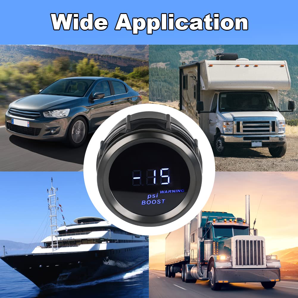 - 1.Easily display at night:Our Turbo Boost Gauge is highly visible with a BLUE Light,easy viewing at all angles during any lighting conditions,practically and safely when driving at night