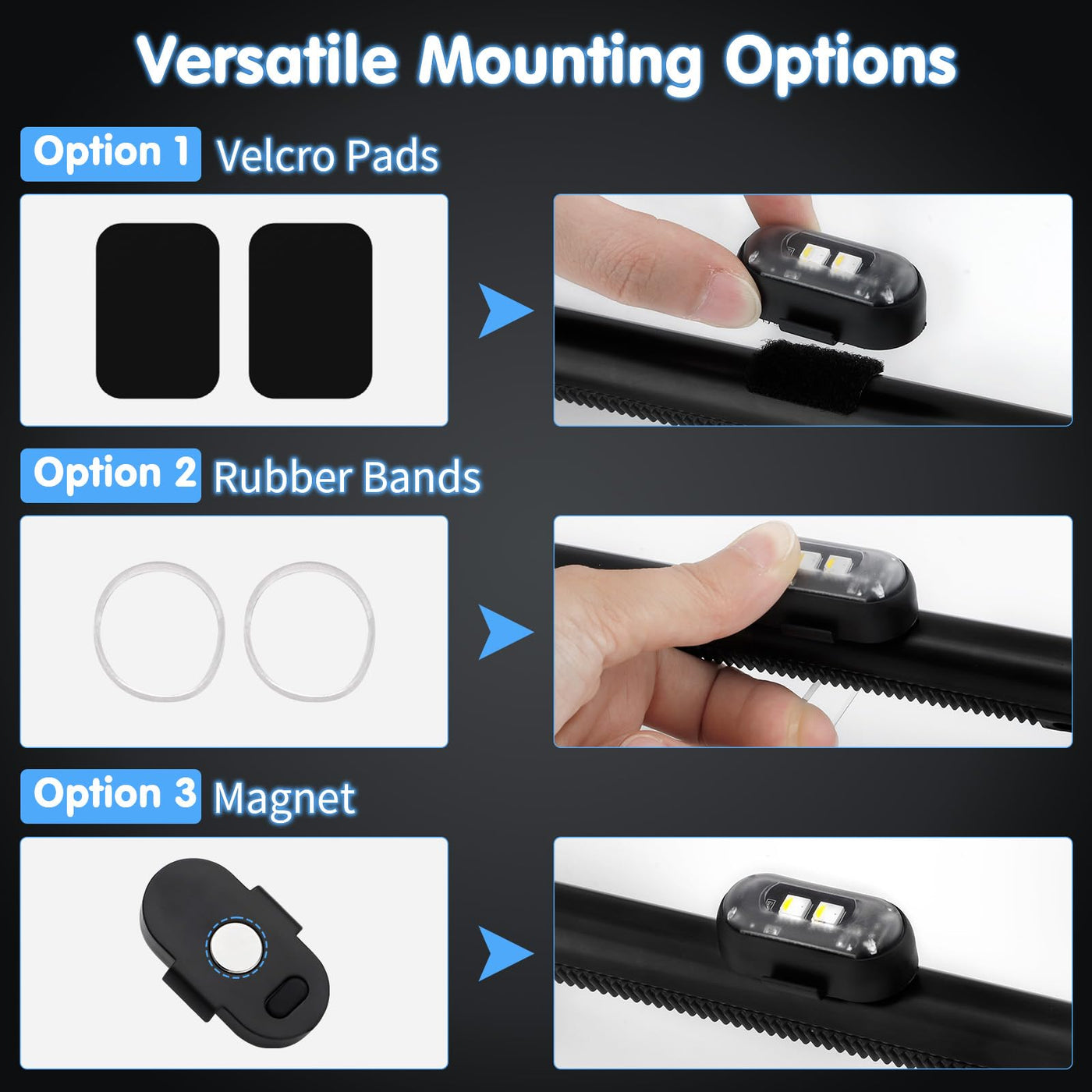 - Easy Installation and Removal: Installing our warning strobe anti-collision lights is a snap! These magnetic wireless anti collision lights come with velcro stickers and rubber bands for effortless setup. Whether youre at home, in your car, or enjoying outdoor activities, you can easily reposition the lights.