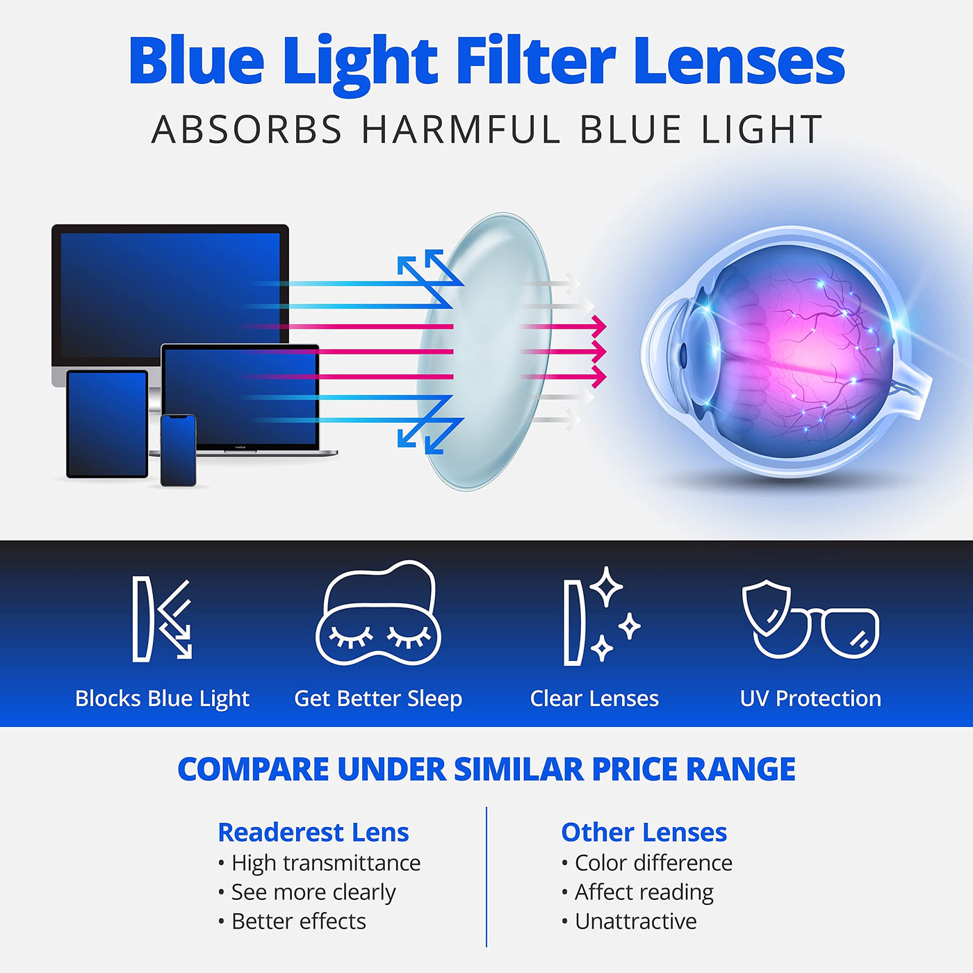 • BLUE LIGHT BLOCKING LENSES. Whether its your computer at work, tv at home, or even your phone, most of us spend the majority of the day looking at screens. This can create eye strain resulting in sore eyes and headaches by the end of the day. Protect your eyes from the harsh blue light of our daily devices.