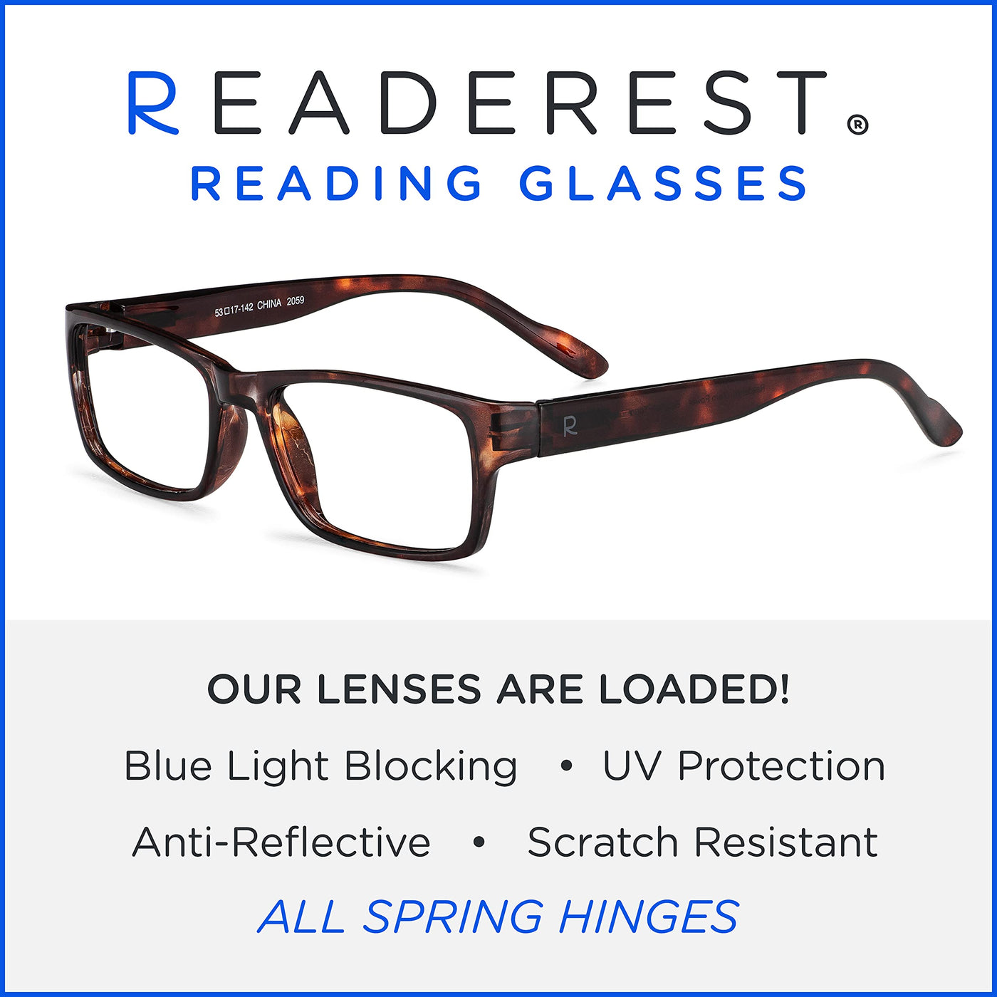 Over 40 Styles Available Tortoise Light Blue Grey Clear 16 Magnifications ✓ ✓ ✓ ✓ Read more Every day our eyes are being exposed to harmful blue light that's emitted from electronic devices, such as cell phones, tablets, televisions, monitors, and laptops. Hours of blue light exposure can cause eyestrain, headaches, physical and mental fatigue. Prolonged exposure to blue light may also cause retinal damage and contribute to age-related macular degeneration, which can lead to loss of vision. As we spend more time looking at digital screens it's important to take proactive steps by wearing blue light blocking reading glasses. Readerest Reading Glasses Benefits Blue Light Blocking Our lenses block up to 40% of harmful blue light rays with clear stylish lenses. While most blue light blocking glasses have a strong yellow tint, our glasses are designed with safety and fashion in mind. Anti-Reflective An anti-reflective treatment eliminates any glare that is caused by light reflecting on the glasses. This reduces the straining of your eyes while using devices or driving at night. UV Protection We are exposed to UV light in our everyday lives from the sun while walking outside, driving, or going for a picnic. Our lenses are put through UV treatment to help your eyes have protection against harmful rays. Scratch Resistant Readerest glasses are given a scratch resistant coating on the front and back of each lens, to ensure that even after an accident your glasses work as good as new. Read more Amplify Your Fashion Complete your fits with Readerest blue light blocking reading glasses that are designed with innovative technology and style. Keep your glasses on all the time as the lenses provide UV protection. Each pair is coated front and back with a clear, scratch-resistant formula Weightless frames that rest comfortably on the bridge of your nose Remain Focused Longer Diminish the blue light affecting your eyes Studies suggest that 60% of people spend more than 6 hours a day in front of a digital device. Long-term exposure to blue light can cause serious damage to your eyes. Help reduce the amount of exposure with Readerest blue light blocking reading glasses designed with state-of-the-art technology and anti-reflective lenses. Embark on the journey to help improve your everyday life with just a single pair of glasses. You will notice a reduction in headaches and less strain on your eyes. Choose any style with a wide range of magnifications best suited for your eyes Every frame is flexible and spring- loaded to have a perfect fit for any size face. Reducing blue light exposure is essential for men, women, and children. We spend hours on our phones, computers, and games. Help your eyes block out the blue light. Read more Magnetic Eyeglass Holders Pearl Stainless Steel & Gunmetal Black Stainless Steel, Black, & Stainless Steel w/ Crystals Stainless Steel - 6 Pack Patented Design ✓ ✓ ✓ ✓ Read more