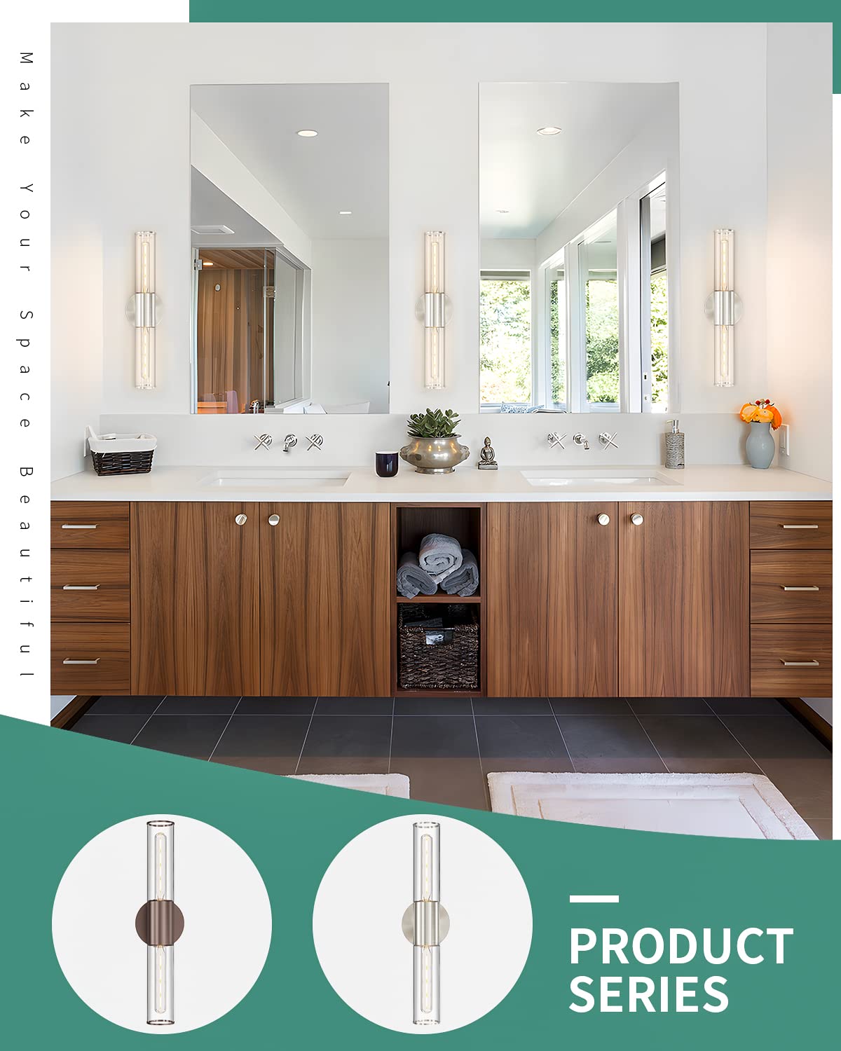 - Unique & Modern Design: Made of sturdy metal and clear glass shade, this 2-light vanity lighting fixture creates an antique and minimalist look. The long glass tube shade design allows the lights to diffuse farther and brighter. Perfect for your bathroom, mirror, powder room, hallway, kitchen, living room, laundry room