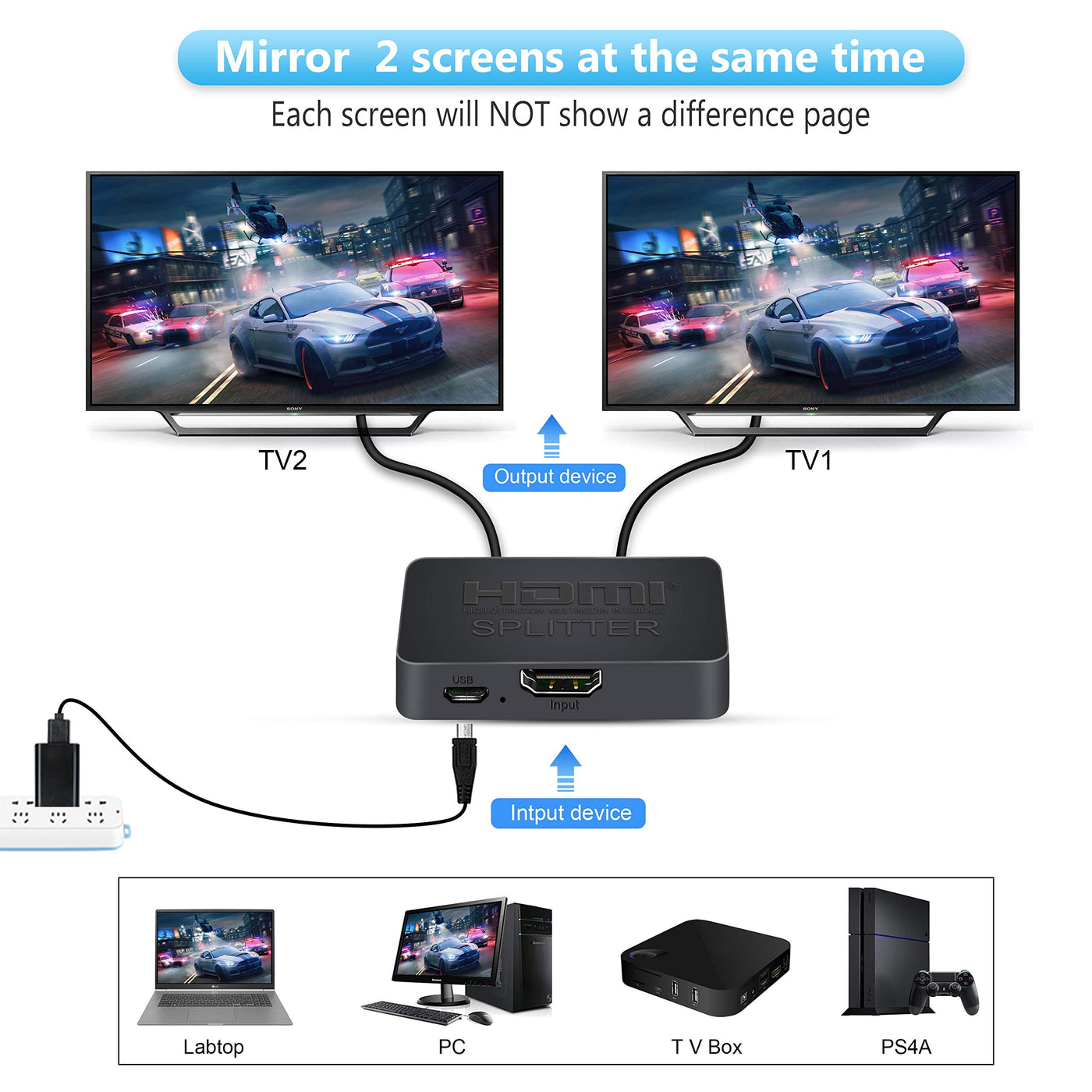 • HDMI2.0b SPLITTER 1 IN 2 OUT - MIRROR ONLY: avedio links HDMI 1 in 2 out Splitter 4K@60Hz can distribute 1 HDMI input signal to dual HDMI display (TV, monitor, projector etc), duplicating or mirror video and audio simultaneously without any loss. Note: Not support extend and CEC!