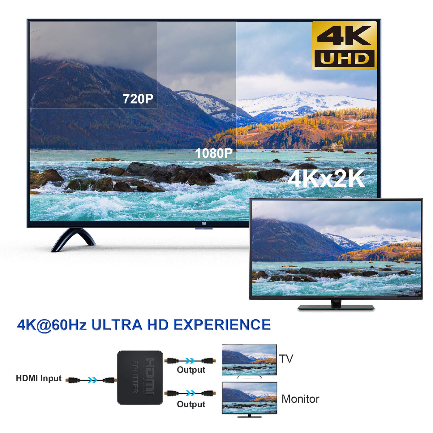 • WIDE APPLICATION: 2 way hdmi splitter 4K@60Hz offers solutions for HDTV retailer, and show site, HDTV, STB, DVD and Projector factory noise space and security concerns data center control, information distribution, conference room presentation, school and corporate training environments.