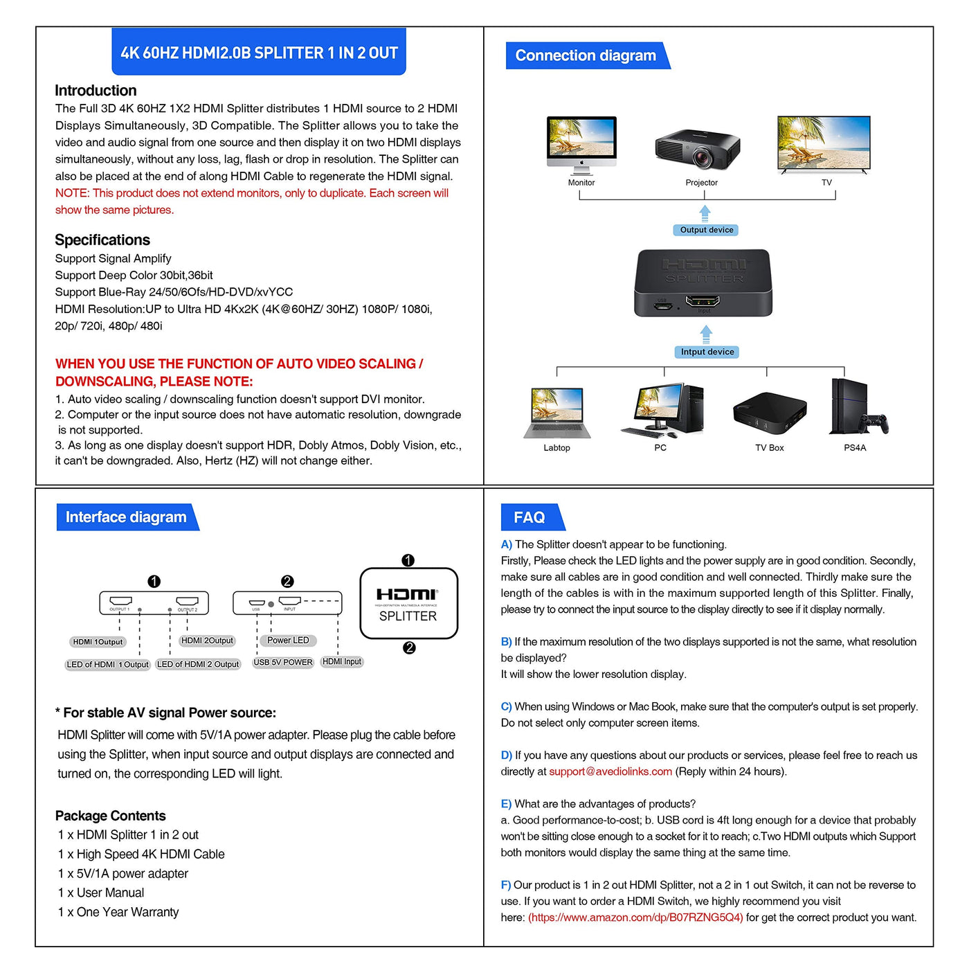 • PACKAGE & PLUG & PLAY: 1 x avedio links dual HDMI splitter 4K@60Hz, 1 x 5V/1A power adapter, 1 x high speed HDMI 2.0 cable. This 1x2 HDMI Splitter is easy to setup and operate. Just connect your HDMI devices and the power adapter, then you can share the most luxurious video and audio with your friends or family.