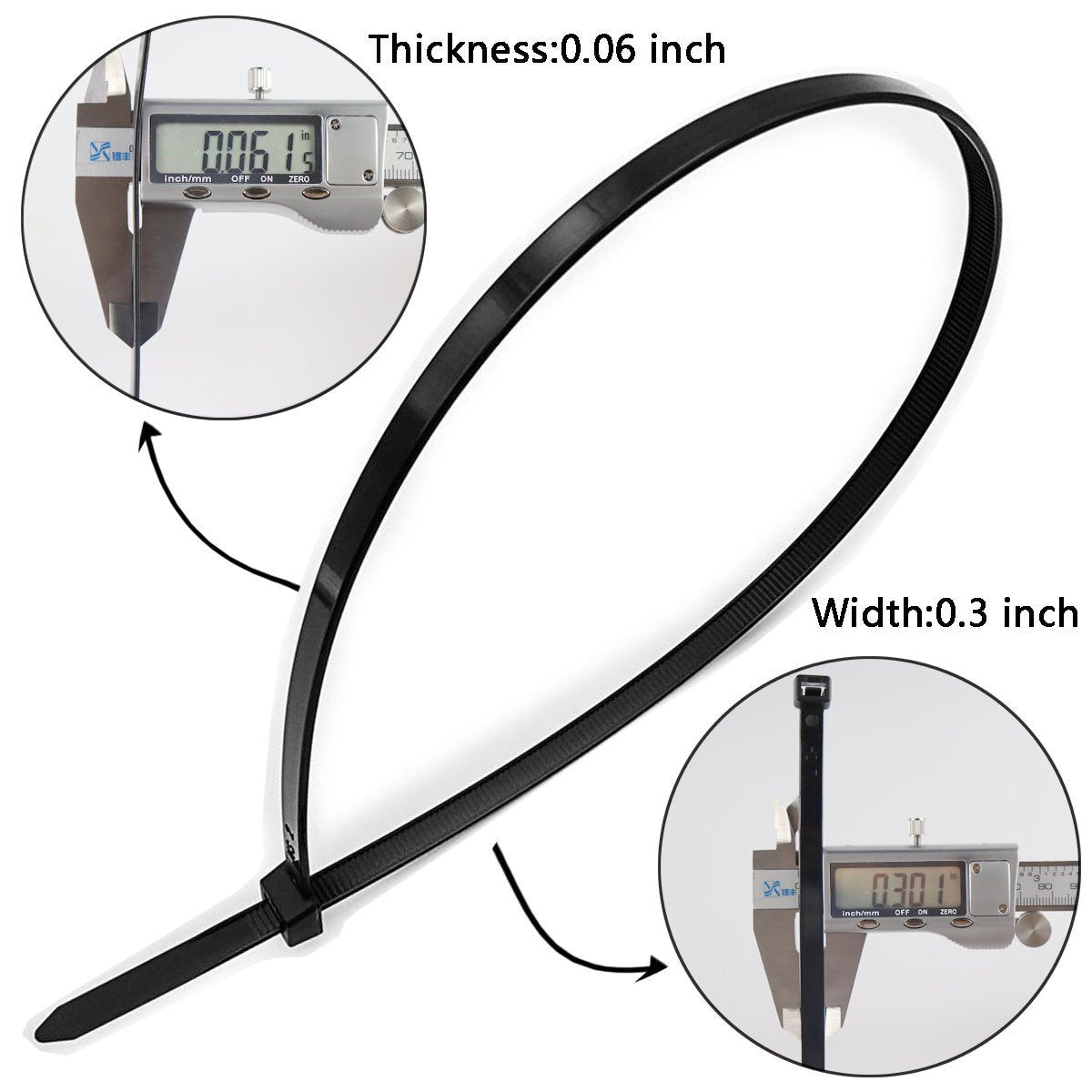 • Durability: With a 0.06in/1.5mm thickness and 0.3in/7.5mm width(national standards), professional heavy duty cable ties' tensile strength is 175LBS, durable and reliable.
