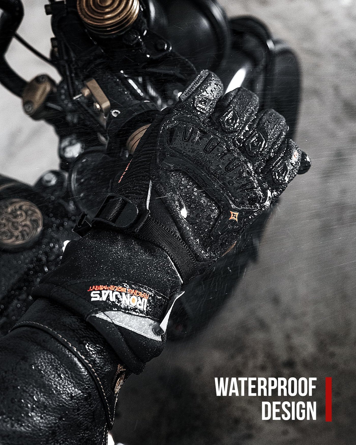 - High-Performance Waterproofing Crafted from high-performance waterproof materials, IRON JIA'S motorcycle gloves provide comprehensive protection in harsh weather conditions. Even in the rain, these gloves keep your hands dry, enabling you to focus on riding without being affected by the weather