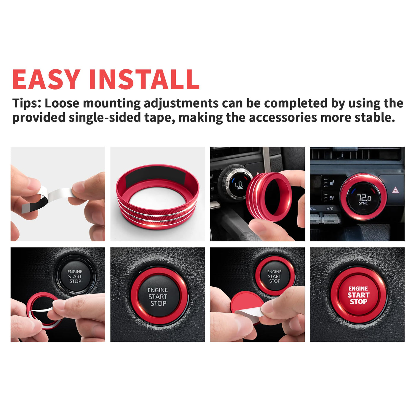 - Easy Installation: Simply clean the surface of the button and insert it into the corresponding knob. If it's loose, use the included foam tape, then press it again for 10s, no additional tools are required. The foam tape will leave no residue and won't damage the car _x000d_