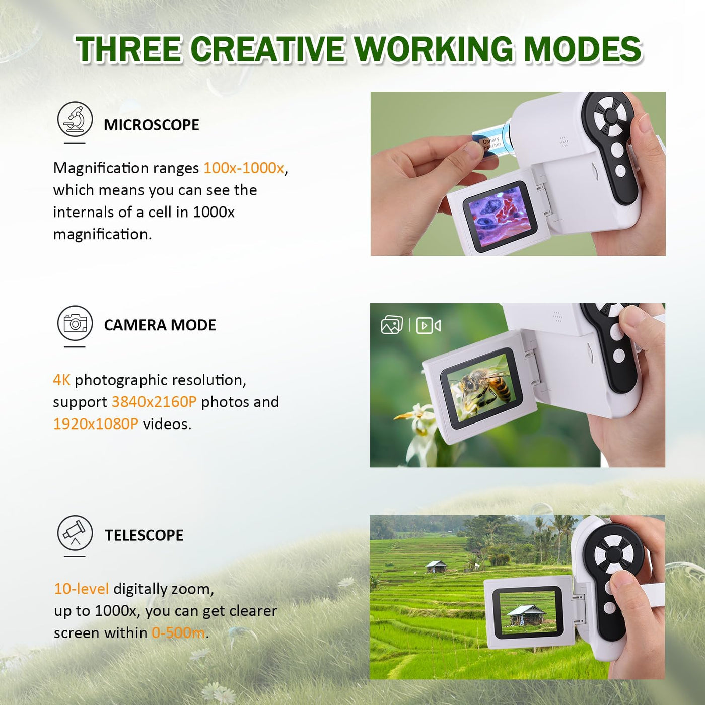 - 3-In-1 Design - 1) Microscope Searching, 2) One-Click Photo & Video Recording, 3) Telescope, choose what you want to enhance child's learning experience. And this digital microscope made of 4K resolution, provides much higher clarity.