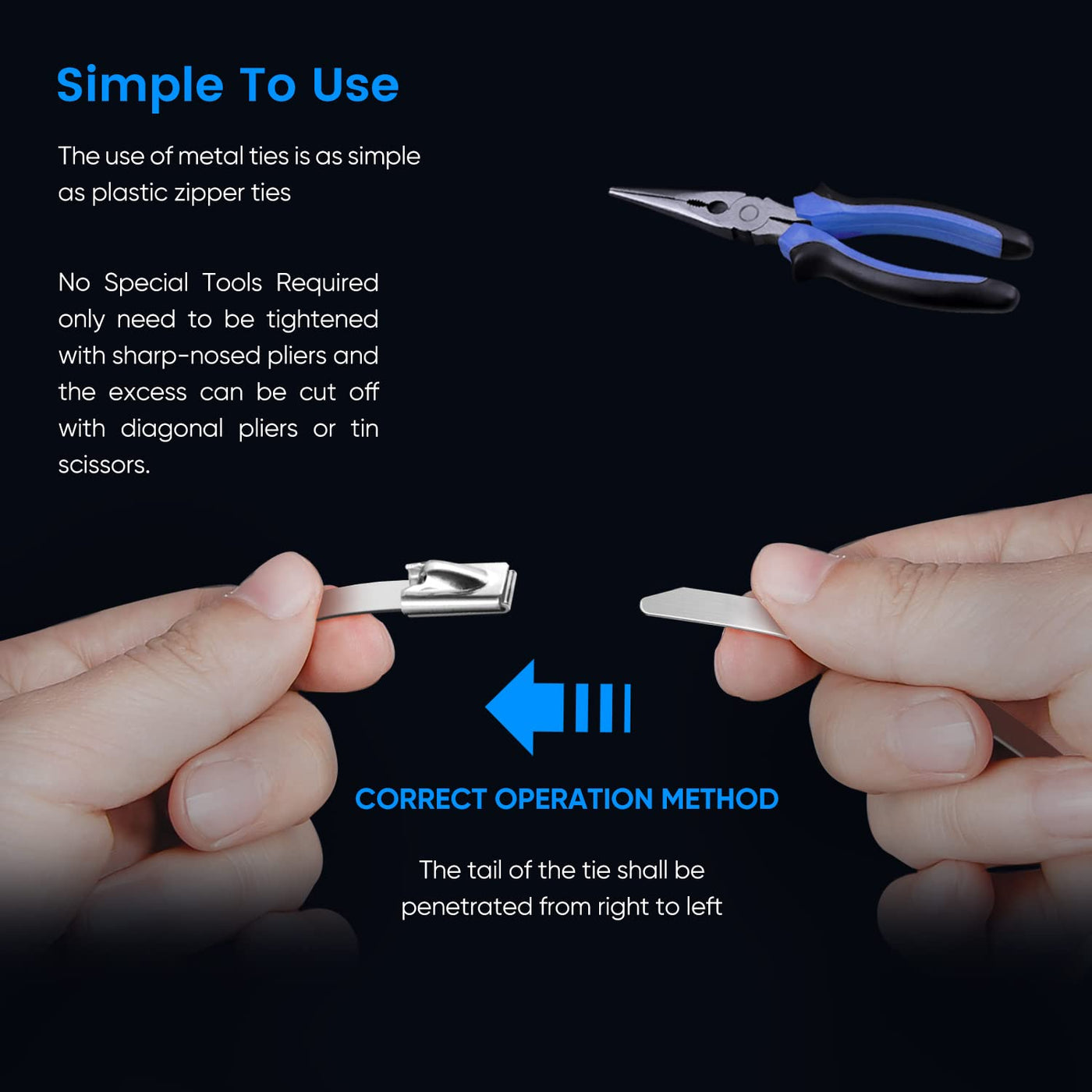 - EASY TO USE : Metal zip ties only need to be tightened with sharp-nosed pliers and the excess can be cut off with diagonal pliers or tin scissors, which allows you to complete the project efficiently.