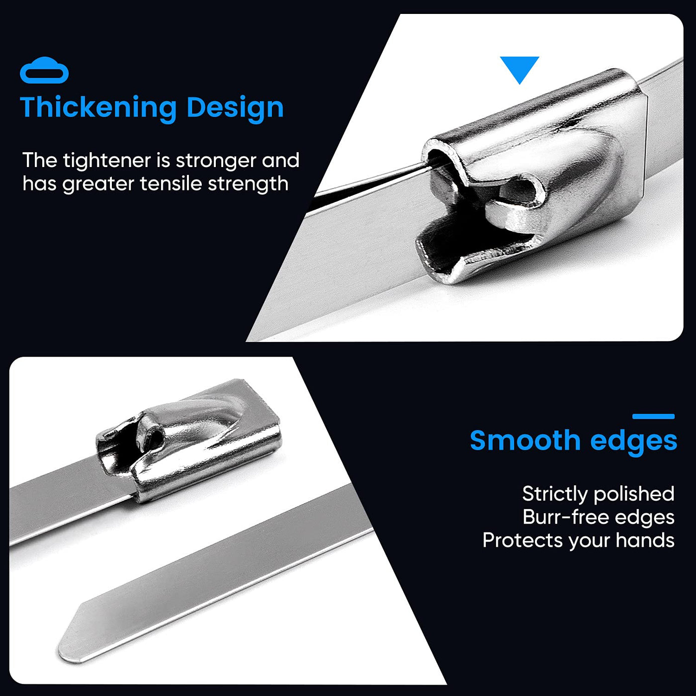- HIGH QUALITY: Our metal zip ties are made of high-quality 304 stainless steel, which has better UV resistance, stretch resistance and wear resistance than traditional plastic ties, and has a longer service life. It can be widely used in various environments, such as humid, exposed to the sun and high temperature places.