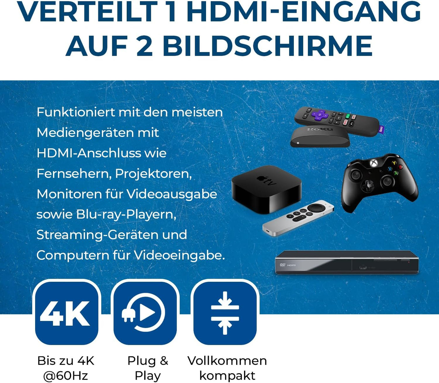 - 4K 18 Gbps Powered HDMI Splitter split one HDMI 2.0 input signal to two HDMI output signals identical to the input signal Input: 1x HDMI & Outputs: 2x HDMI | Comes with EDID management, 1 in 2 out HDMI Splitter