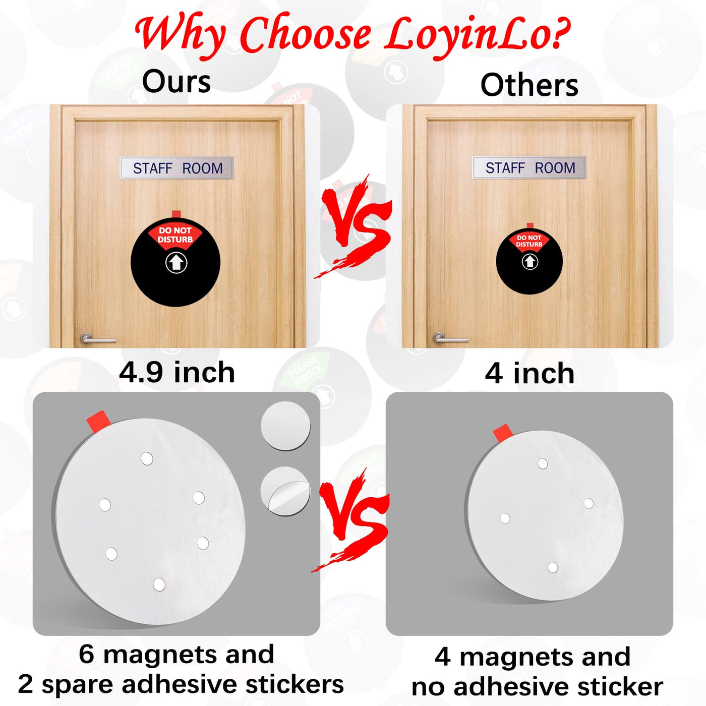 PROTECT YOUR PRIVACY You can easily switch between the four options. The status will still remained unless you change it manually. DO NOT DISTURB PLEASE KNOCK IN A MEETING OUT OF OFFICE PRIVACY DOOR SIGN PRIVACY DOOR SIGN VACANT OCCUPIED SIGN VACANT OCCUPIED SIGN DO NOT DISTURB SIGN DO NOT DISTURB SIGN CONTENT do not disturb/please knock/in a meeting/out of office do not disturb/please knock/in a meeting/out of office vacant/occupied vacant/occupied do not disturb/welcome please knock do not disturb/welcome please knock COLOR Black Silver Silver Black Silver black SIZE 4.9'' x 4.9'' x 0.3'' 4.9'' x 4.9'' x 0.3'' 7'' x 2'' x 0.3'' 7'' x 2'' x 0.3'' 7'' x 2'' x 0.3'' 7'' x 2'' x 0.3'' MAGNETISM ✓ ✓ ✓ ✓ ✓ ADHESIVE STICKER ✓ ✓ ✓ ✓ ✓ PRIVACY OFFICE SIGN PRIVACY OFFICE SIGN VACANT OCCUPIED SIGN IN USE/AVAILABLE SIGN IN USE/AVAILABLE SIGN VACANT OCCUPIED SIGN CONTENT do not disturb/please knock/in a meeting/out of office do not disturb/please knock/in a meeting/out of office vacant/occupied in use/available in use/available vacant/occupied COLOR Silver Black White White Silver Silver SIZE 5 '' x 5 '' x 0.3'' 5 '' x 5 '' x 0.3'' 6.7 '' x 2'' x 0.3'' 6.7 '' x 2'' x 0.3'' 7'' x 2'' x 0.3'' 5 '' x 5'' x 0.3'' MAGNETISM ✓ ✓ X X ✓ ✓ ADHESIVE STICKER ✓ ✓ ✓ ✓ ✓ ✓ PRIVACY OFFICE SIGN PRIVACY OFFICE SIGN PRIVACY OFFICE SIGN PRIVACY OFFICE SIGN CONTENT Do Not Disturb/Come in Welcome/Out of Office/in a Meeting/Back Soon/On Vacation Do Not Disturb/Come in Welcome/Out of Office/in a Meeting/Back Soon/On Vacation Do Not Disturb/Come in Welcome/Out of Office/in a Meeting/Back Soon/Working Remotely Do Not Disturb/Come in Welcome/Out of Office/in a Meeting/Back Soon/Working Remotely COLOR Silver Black Silver Black SIZE 5 ''x 5 ''x 0.3'' 5 ''x 5 ''x 0.3'' 6 ''x 6 ''x 0.3'' 6 ''x 6 ''x 0.3'' MAGNETISM ✓ ✓ ✓ ✓ ADHESIVE STICKER ✓ ✓ ✓ ✓
