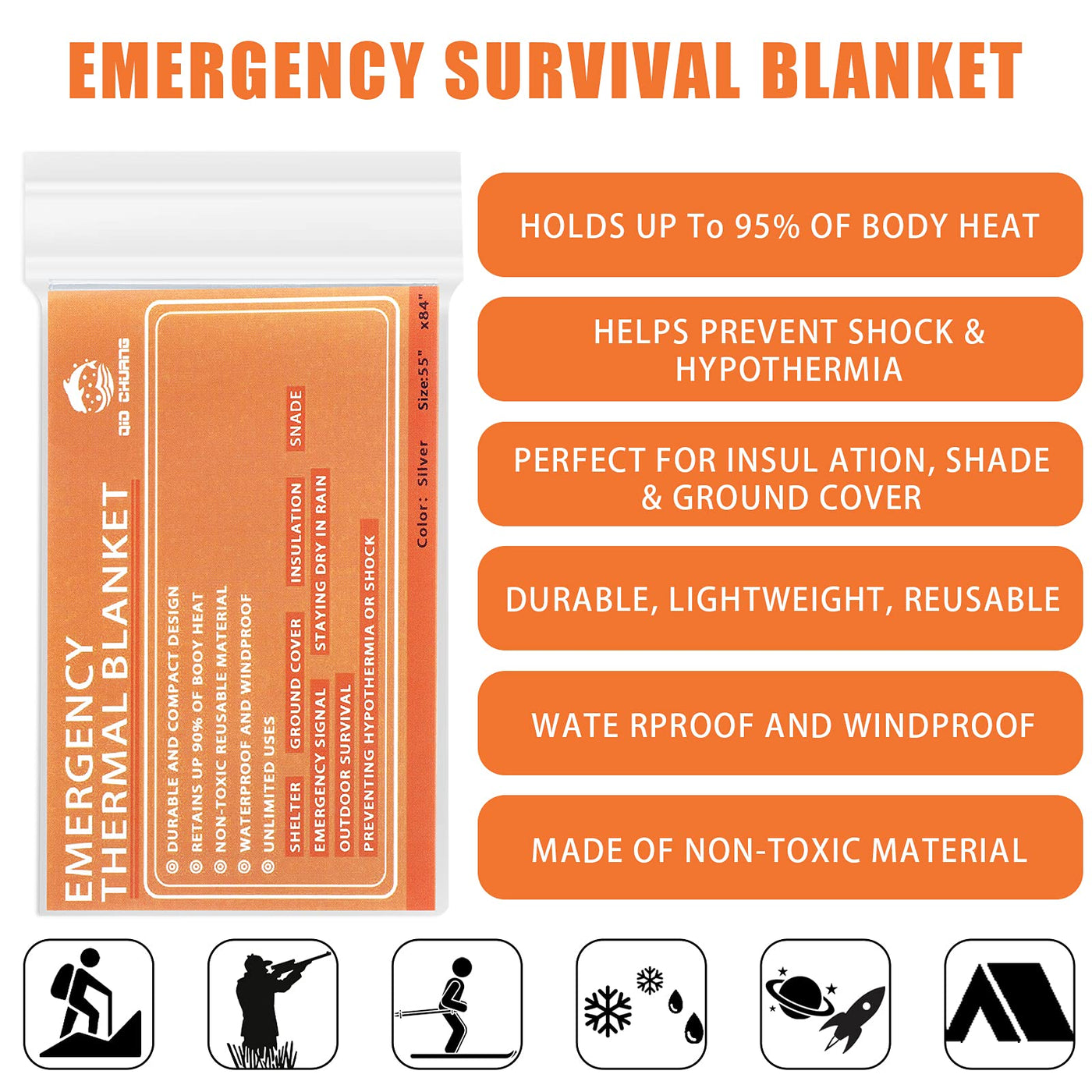 - Space Blanket Survival kit Camping Blanket (Pack of 4)- Each survival blanket is individually folded, wrapped, and sealed for easy storage and retrieval. They are reusable, waterproof and windproof and can also be used for both ground cover and shade. Durable and advanced aluminized dual-sided Mylar blankets are perfect for conserving body heat in emergency survival situations.