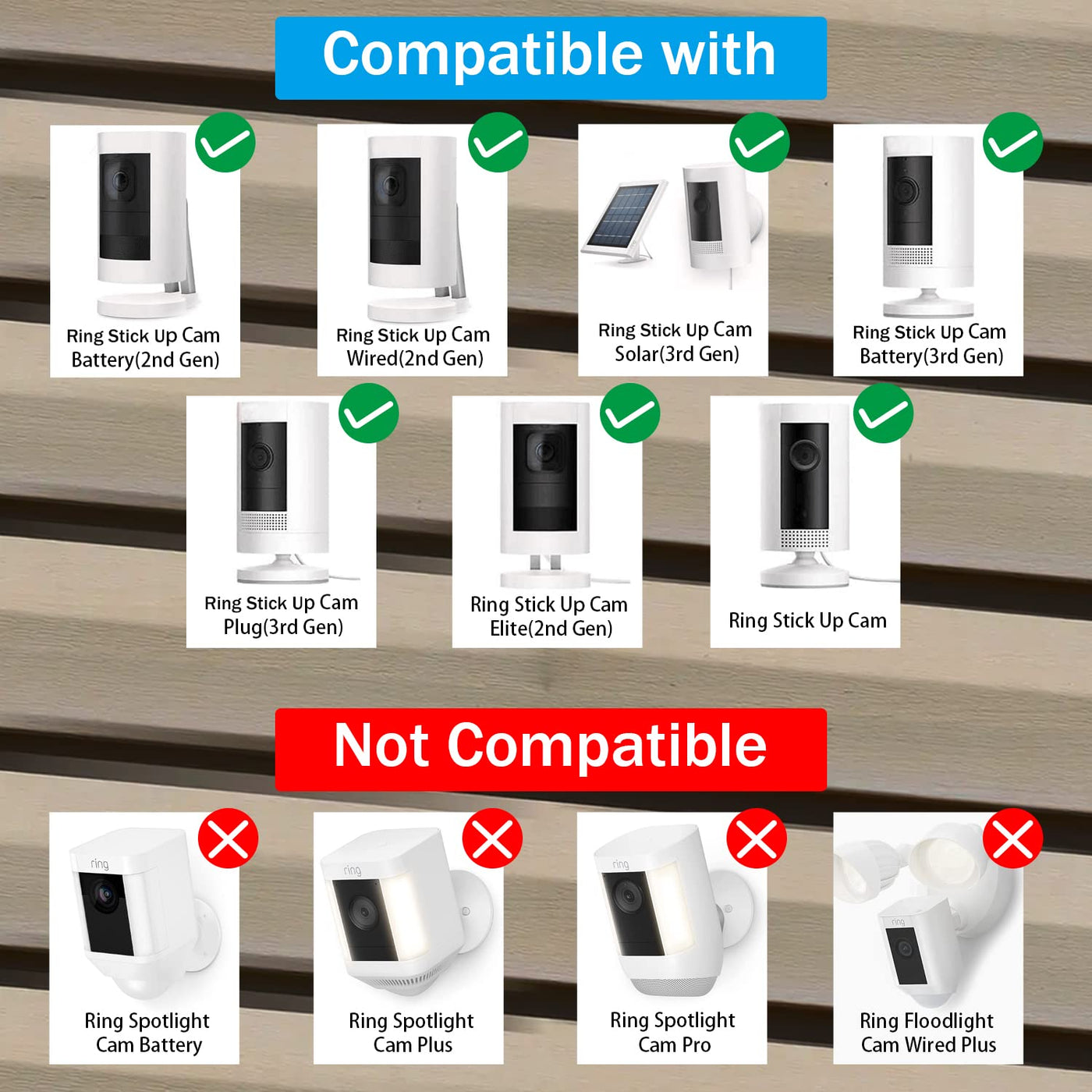 • Universal Bracket: This bracket is a accessories (NOT Included Camera),Perfectly compatible with Ring Stick Up Cam and Ring Indoor Cam(1st Gen), more compatible with Arlo/Wyze cam/Eufy Cam/Roelink Argus and other cameras with standard 1/4 threaded holes.