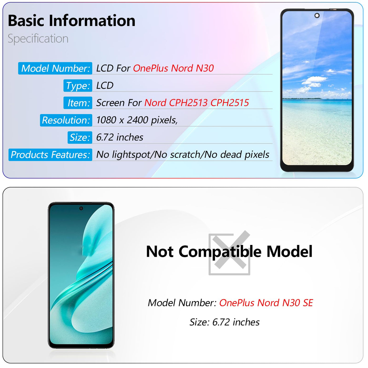 - The display screen is compatible for OnePlus Nord N30 5G Nord CPH2513 CPH2515 screen replacement LCD display.Please make sure your phone model before place the order.