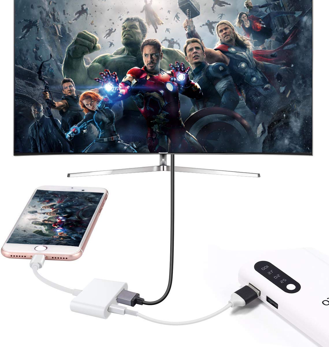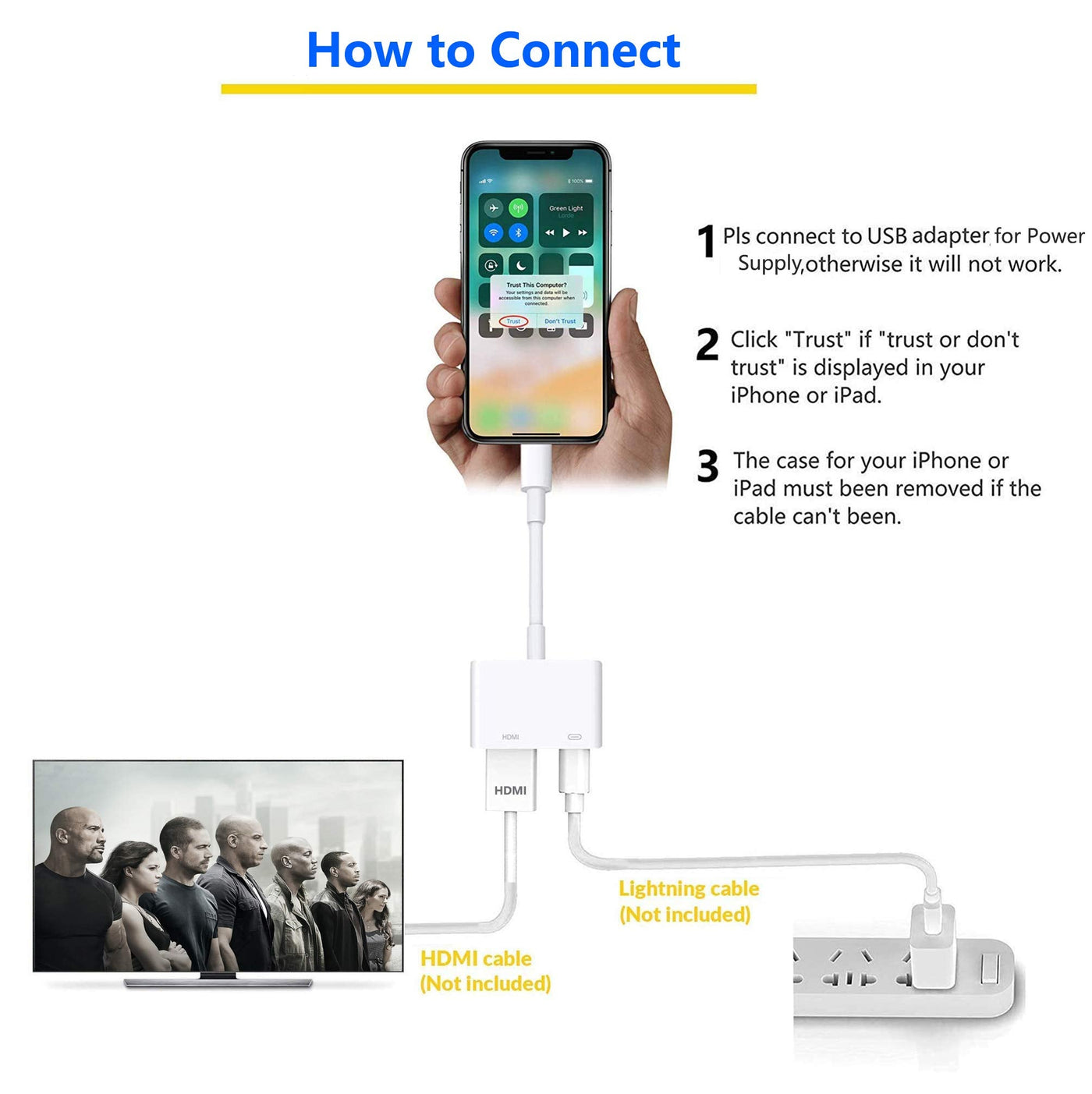 This lightning to HDMI Adapter transfers signals from your iPhone to HDTV / Projector / Monitor clearly and quickly. It’s compact and lightweight. You can share your movie/video/pictures and any other entertainments with your family. 1080P High Quality HDMI Output: Supports up to 1080P HD output and shows you perfect pictures/ videos. Plug And Play: No need for WIFI, APPS or Hot spots. Easy to use, fast and stable connection, automatic mirroring. Potable and Durable. Compatibility With: iPhone 12/ iPhone12 Mini/iPhone 12 Pro/ iPhone 12 Pro Max, iPhone SE 2, iPhone 11/ iPhone 11 Pro/ iPhone 11 Pro Max iPhone X/XR/XS /XS Max iPhone 8, iPhone 8 Plus. iPhone 7, iPhone 7 Plus. iPhone 6, iPhone 6 Plus, iPhone 6s, iPhone 6s Plus. iPhone 5, 5c, 5s, SE. iPad Air, iPad with retina display. iPad mini, iPod Touch 5th gen, and iPod nano 7th gen. How to Use: . Step 1: Insert your charge cable into the 5V/2A USB AC Adapter (not included) to power supply this HDMI Adapter.(Recommend original iPhone Charge cable) . Step 2: HDMI Port: connect to your TV or big screen via HDMI cable. . Step 3: Connection: connect into your Phone, Pad, Pod. . Step 4: Please click the "Trust" and wait 6-10 seconds to synchronize the phone screen with the TV. What You Get: 1x Lighting to HDMI adapter and 12 months worry-free warranty. Attention Please !!! 1.The iPhone to HDMI adapter compatible with Youtube, Chrome, facebook, VLC media player etc. But ★NOT SUPPORT★ not compatible with Netflix, Amazon video, HBO go, HULU, SKY Q and Honda motor. 2.The adapter need power supply, please make sure the lighting female port connect to the charging power supply, if not , the item will not work! ( Strongly recommended original USB cable and adapter 5V/2A). 3.The adapter will get a little hot when using but it's NORMAL and SAFE.
