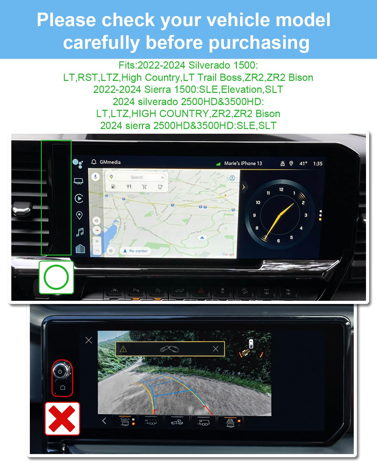 • Friendly Reminder The New 2022-2024 Sierra&Silverado 1500 and 2024 Sierra&Silverado 2500HD/3500HD have two 13.4-inch screens, this product is suitable for trim levels 2022-2024 Silverado 1500 (LT, RST, LTZ, High Country, LT Trail Boss, ZR2, ZR2 Bison) Sierra 1500 (SLE, Elevation, SLT) and 2024 Silverado 2500HD/3500HD (LT, LTZ, High Country, ZR2, ZR2 Bison) , 2024 Sierra 2500HD/3500HD (SLE, SLT) , if you are not sure about your screen size, you can refer to picture 2 before buying.