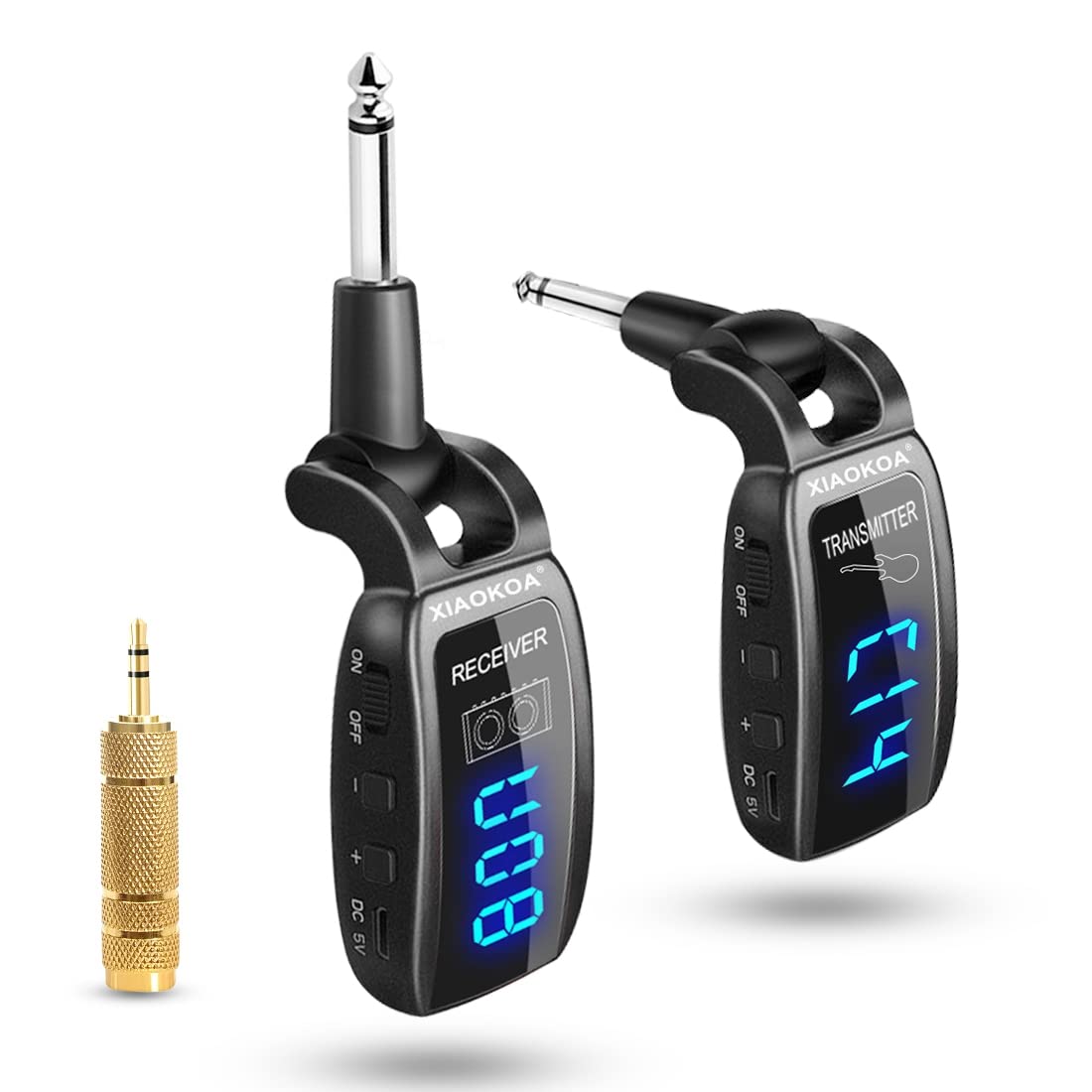 XIAOKOA Rechargeable Electronic Guitar Wireless System Wireless transmitters and receivers can be used for electro acoustic instruments such as guitars, bass, violins, etc. Easy to use,plug and play. Wireless Guitar Tansmitter Receiver LED Display You can intuitively learn and master the frequency, volume and power and adjust them easily. 6.35mm Jack We also offer 3.5mm adapter (included)for receiver to connect more Amplifier Equipments. 270° Rotatable Plug Design Available for instruments with input jack in different positions. Read more Multiple Pairing Support up to 15 sets of music instrument working at the same time Durable Battery Built-in 500 mAh rechargeable battery, if full charged, the system can work for about 6 hours. Long Distance Transmission The max transmission range is 164ft/50m. The optimal transmission range is 65ft/20m. Read more The wireless transmitter & receiver ideal for variety occasions Widely used in different occasions, such as concert, symphony, teaching, street performance and so on. Read more