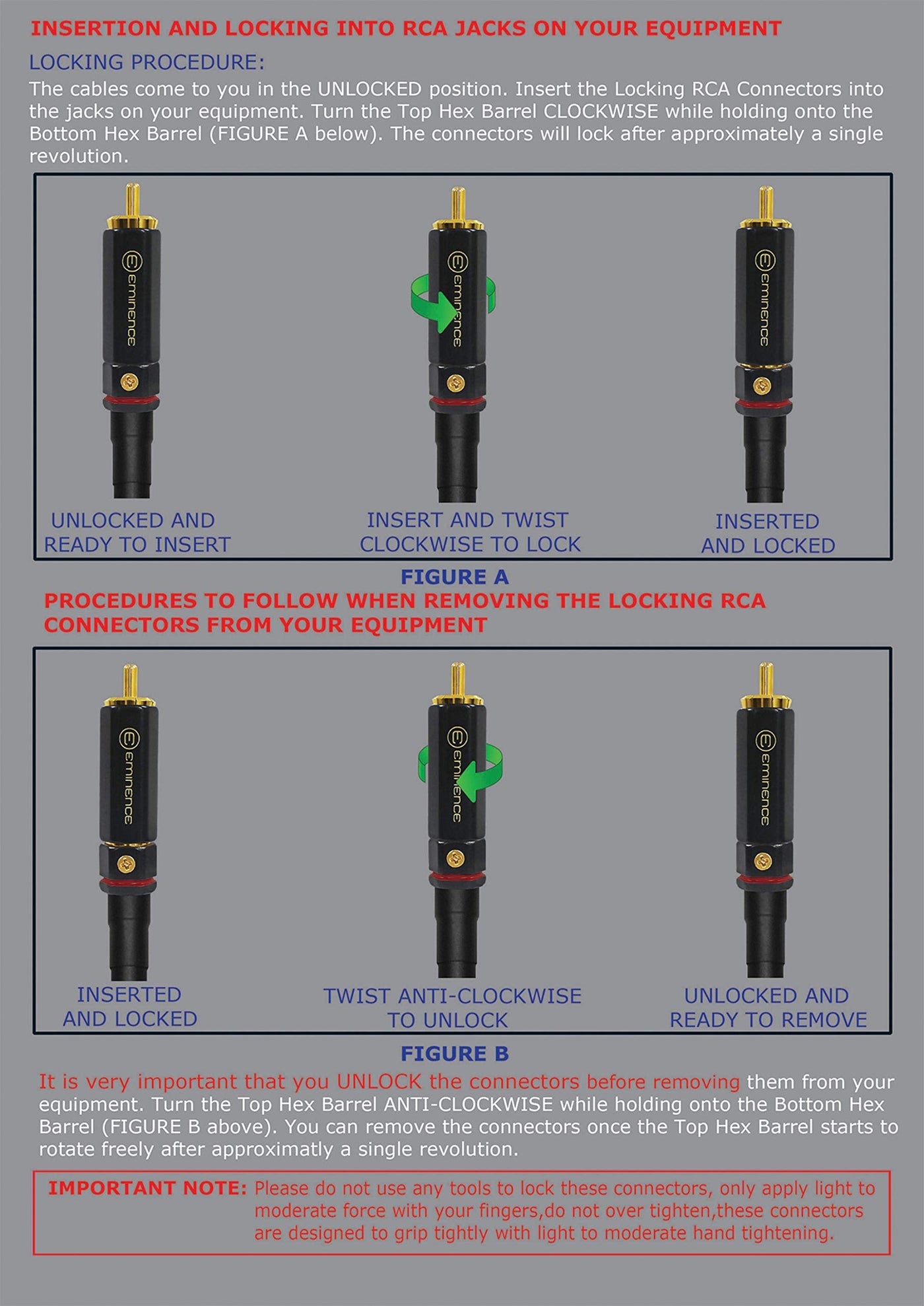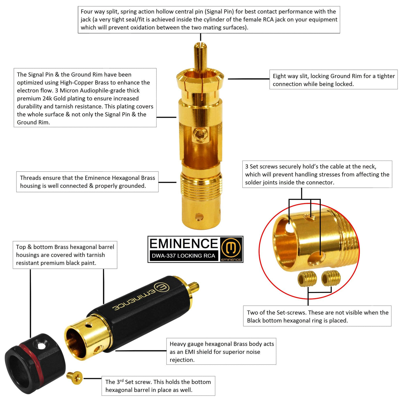 - Audiophile Locking RCA connectors: 3 Micron thick Gold plating to ensure increased durability and tarnish resistance. Four way split, spring action hollow central pin for best contact performance. 3 set screws securely holds the cable at the neck.