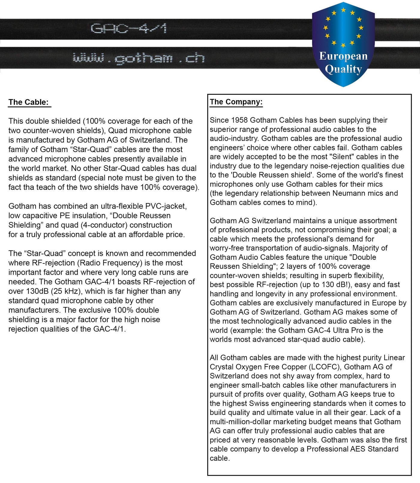 - Gotham GAC-4/1, Star-Quad LCOF Copper cable sports extensive shielding (2x100% coverage LCOF Copper shields), by far the best shielded quad cable in the market . Boasts RF-rejection of over 130dB (25 kHz), & ideal for even very long cable runs.
