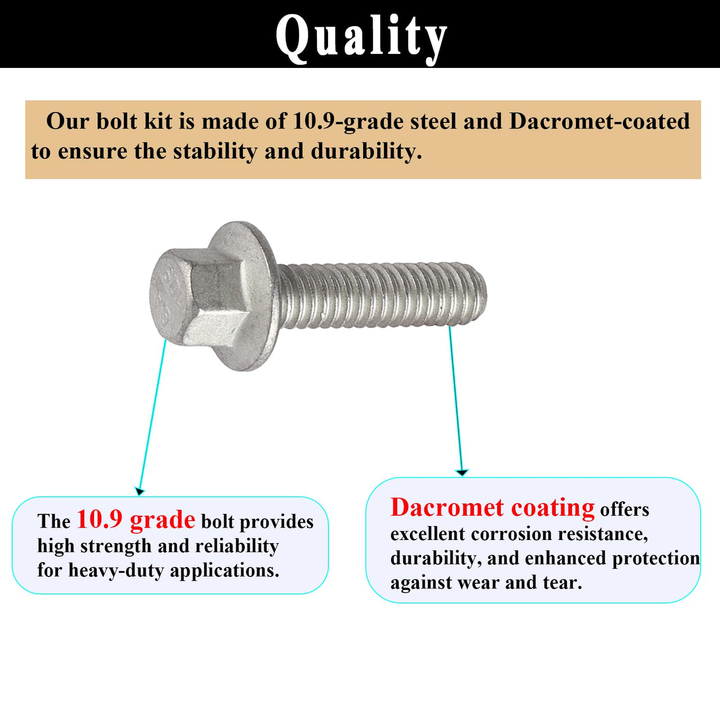 - GRADE 10.9 HIGH-STRENGTH STEEL. Each bolt is manufactured from heavy-duty alloy steel with a Grade 10.9 ratingbuilt to withstand extreme torque, vibration, and heat for long-lasting, secure performance.