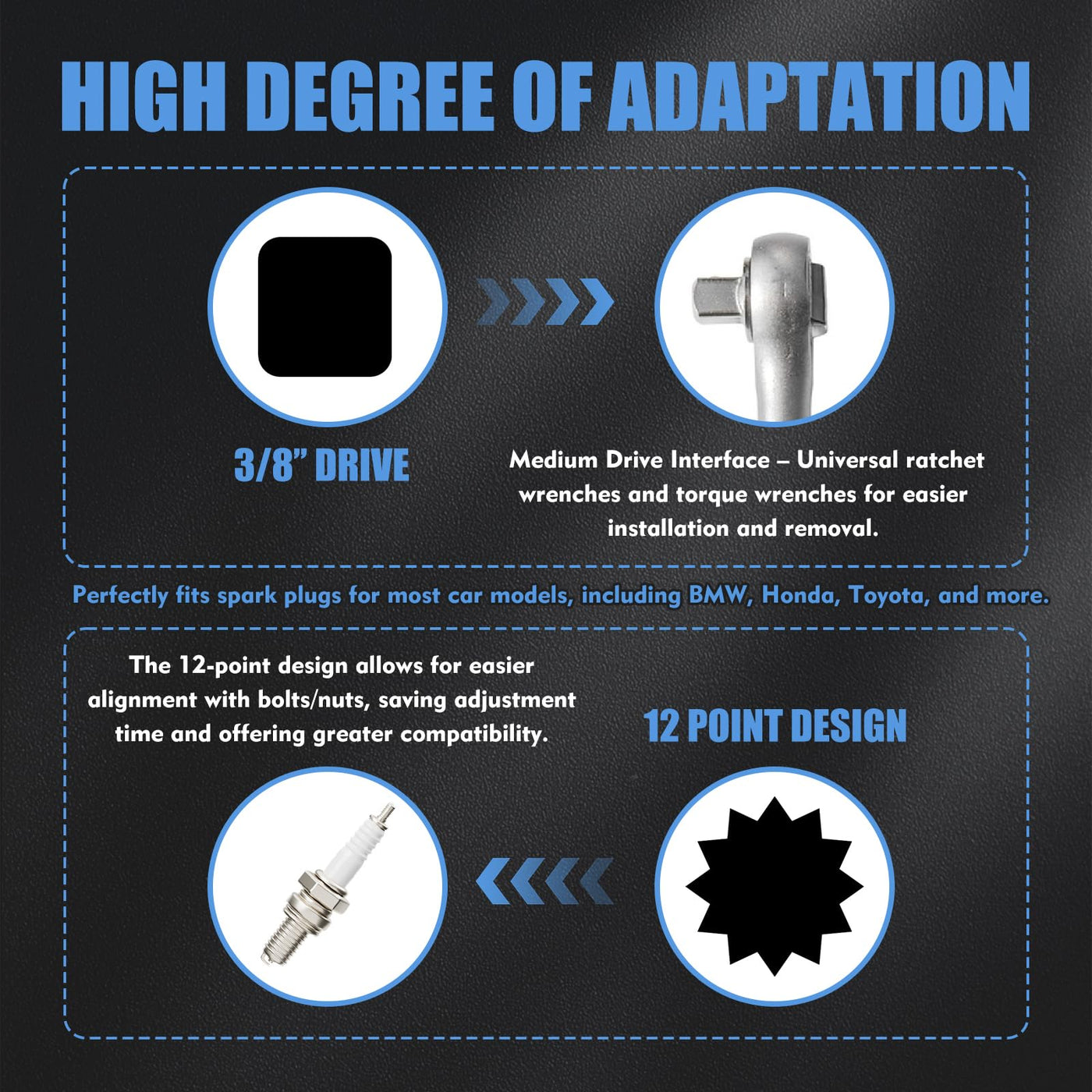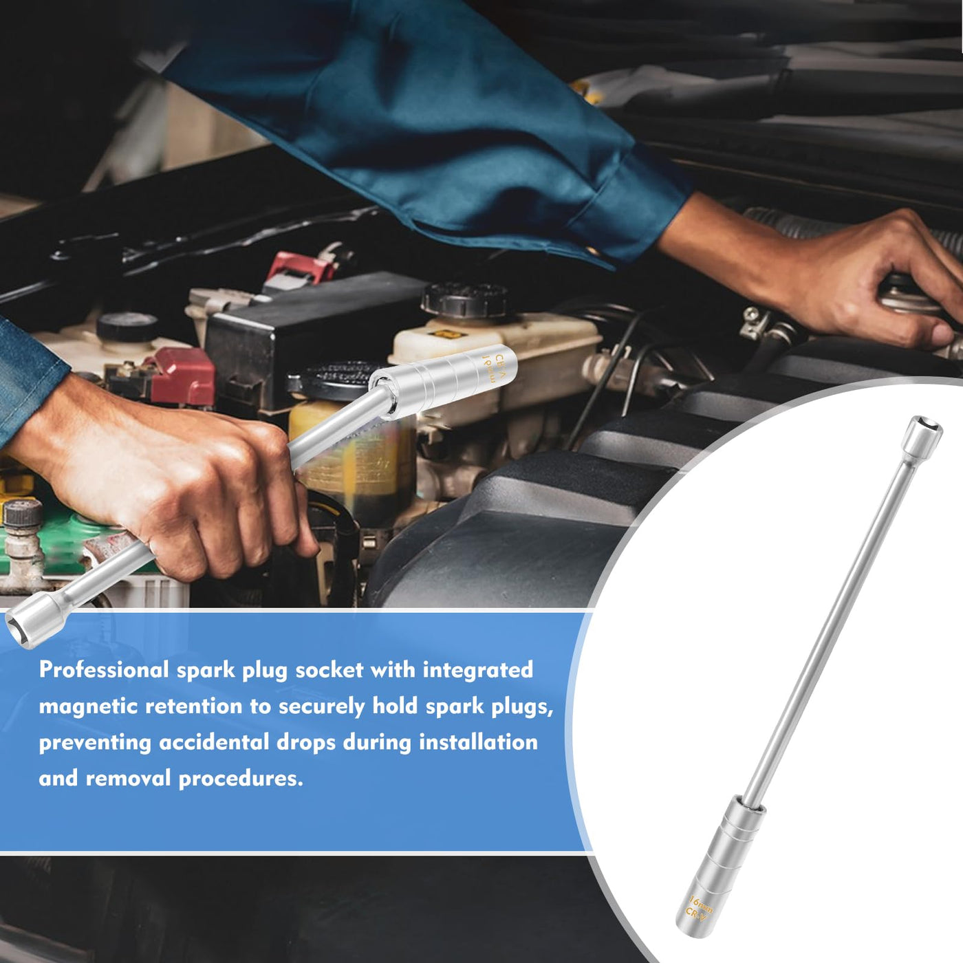 - [Strong Magnetic Retention Ensures Safe Operation] The built-in high-strength magnet securely holds the spark plug during removal and installation, effectively preventing accidental drops into the cylinder. The 12-point spark plug socket provides a tighter fit, reducing slippage and wear. Specifically designed for spark plugs, it enhances grip strength for easier removal.