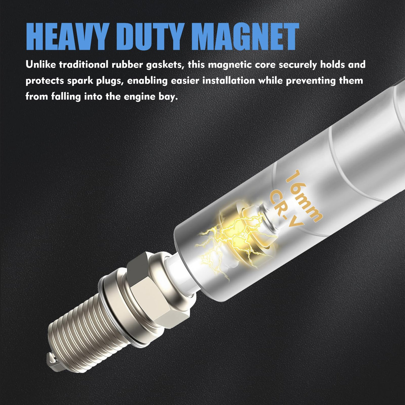 - [User-Friendly Operation] This magnetic spark plug socket features an intuitive design for effortless installation and removal. Simply insert the spark plug into the socket until it's securely held by the magnet, then carefully guide the assembly into the spark plug well. Ensure full engagement between the socket and spark plug before applying torque. It's designed to make spark plug changes easier whether you're a seasoned technician or working on your home garage project.
