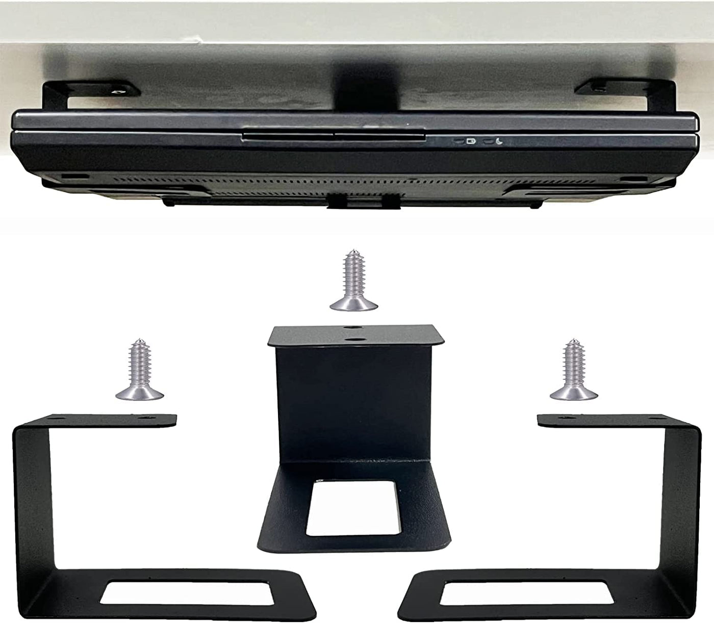 Come with 3 racks, 3 Screw (one kit) to hold one laptop - No laptop included. Screws Mounting - Contains 3 short stainless steel screws, Fits any device with a maximum thickness of 1.8 inches (50MM). There are no real restrictions on the length and height of the device. Install under shelves, desks, cabinets, etc. Hold up to 1.8 inches (50MM) thick laptops, tablets, keyboards, Routers, Modems, Cable Box, Network Switch & More. Keep your desk organized and neat. Mounted these on the bottom of a sit/stand desk to free some desk real estate up.