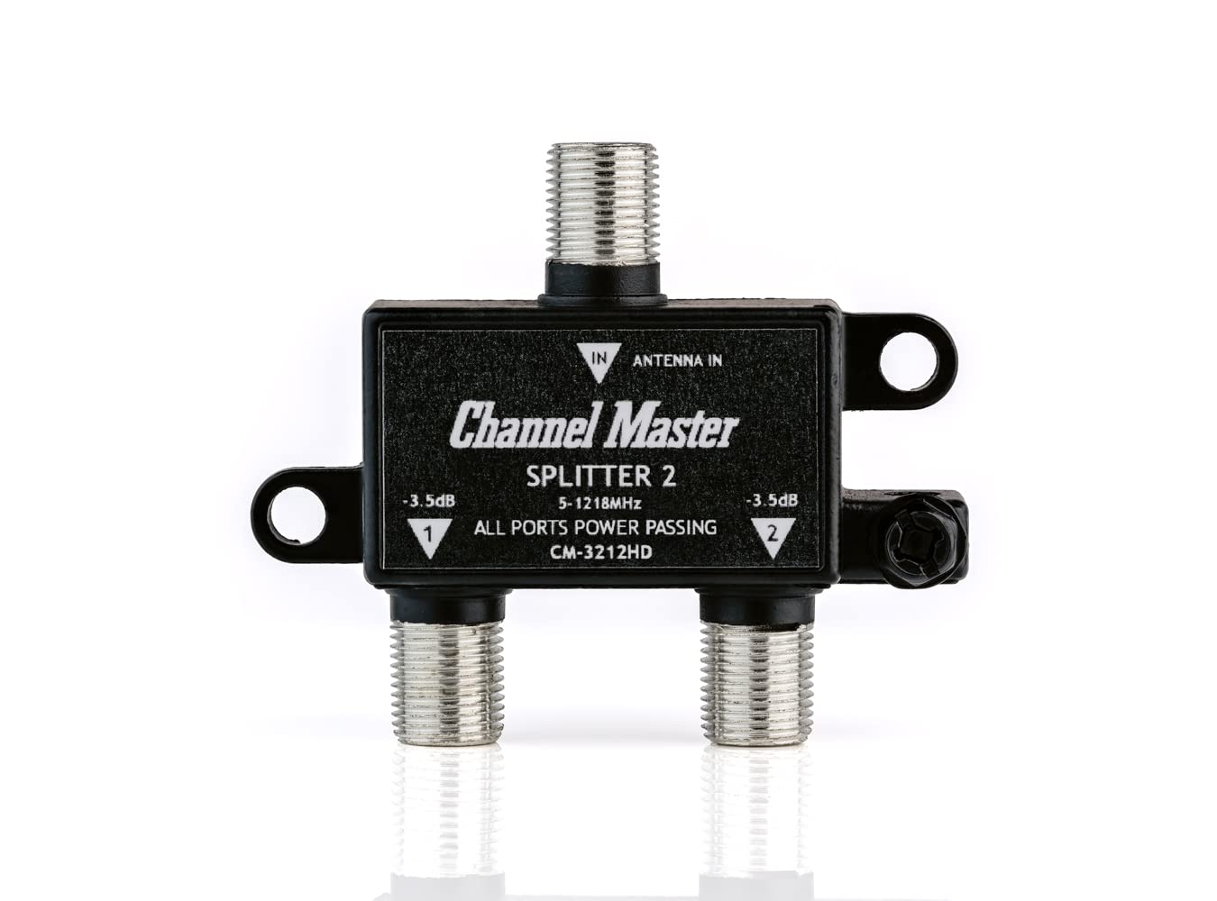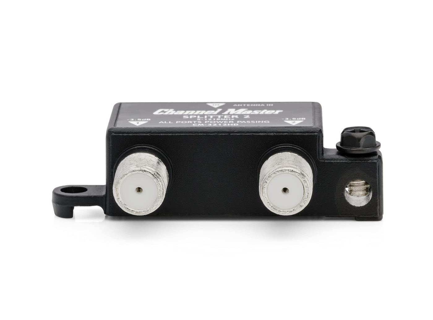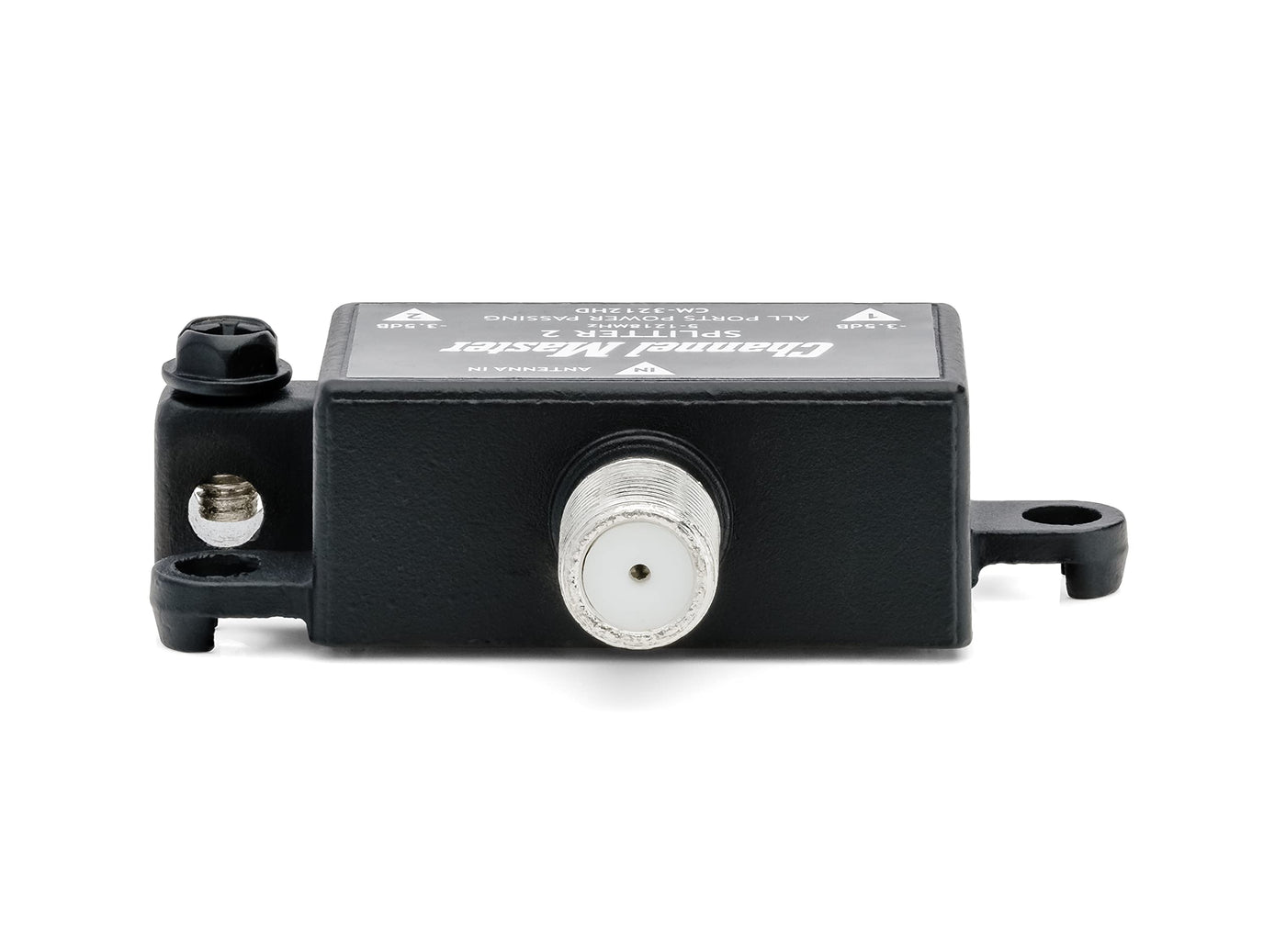 The Channel Master Splitter 2 divides the TV signal from your antenna to connect two TVs. The Channel Master Splitter 2 divides the TV signal from your antenna to connect two TVs. The Channel Master HD Antenna Splitter 2 is a 2-way RF splitter that offers exceptional performance and long-term reliability for those looking to split a TV antenna signal to multiple televisions. This high quality splitter is weather proof for outdoor use and provides significant advantages in center conductor retention and electrical performance that basic splitters do not offer. Not Your Typical Connector The Channel Master Splitter 2 is not your typical cheap Gold-Plated splitter, instead we put our focus on what really matters. Power Passing The Channel Master Splitter 2 is specifically designed for TV antenna installations. The Splitter 2 can be used with or without an antenna pre-amplifier. When used with an antenna pre-amplifier the Splitter 2 simplifies installation allowing DC power to pass through any of the output ports up to the pre-amplifier. Digital Signal Future Proofing Channel Master Splitter 2 delivers enhanced reliability for signal reception of current and future standards such as 4K, Ultra HD and HDR. Excellent Shielding Effectiveness A splitter with poor shielding can let unwanted signals penetrate and interfere with your signal. Interference introduced through the splitter will cause signal quality issues resulting in intermittent or complete loss of audio and video. Indoor/Outdoor Design All Metal housing and weather-sealed ports provide superior defense against long-term corrosion. What’s Included Splitter (2) Mounting Screws 1-Year Limited Warranty Features Splits TV Signals to Feed 2 TVs Lightweight and Compact Professional-Grade Performance Easy Install Works with Analog, Digital and HD Broadcast Signals High-Quality Weatherproof Design for Use Outdoors Operating Frequency 5-1002 MHz Insertion Loss 3.5 dB Return Loss 20 dB Isolation Between Outputs 22 dB Surge Withstand 6000VAC, 200A Power Pass Yes Input Connector F-type Output Connectors F-type Weight 2.5 oz Size 2.375 x 2.0 x 0.625 in