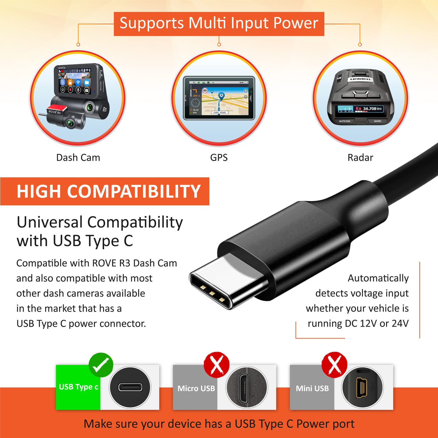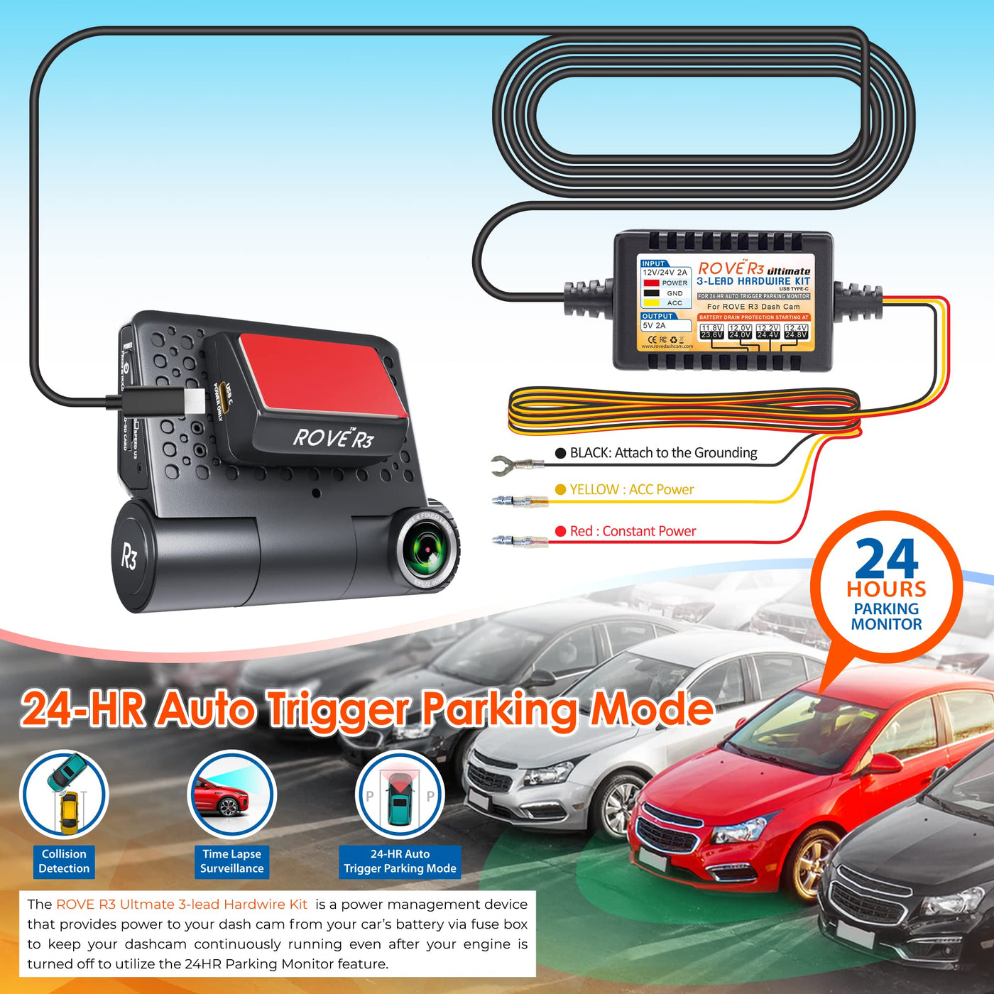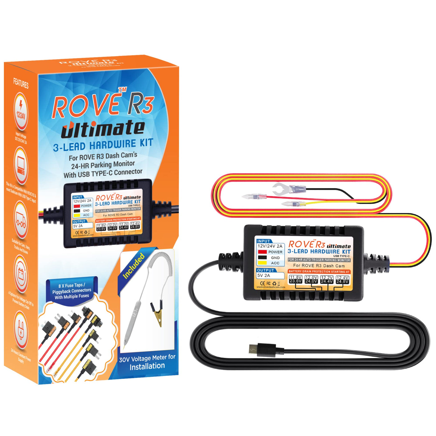 - Compatible for ROVE R3 Dash Cam with USB Type C This dash cam hardwire kit is specially designed for ROVE R3 touch screen, 3 channel dash cam to be used for 24-hours parking monitor.