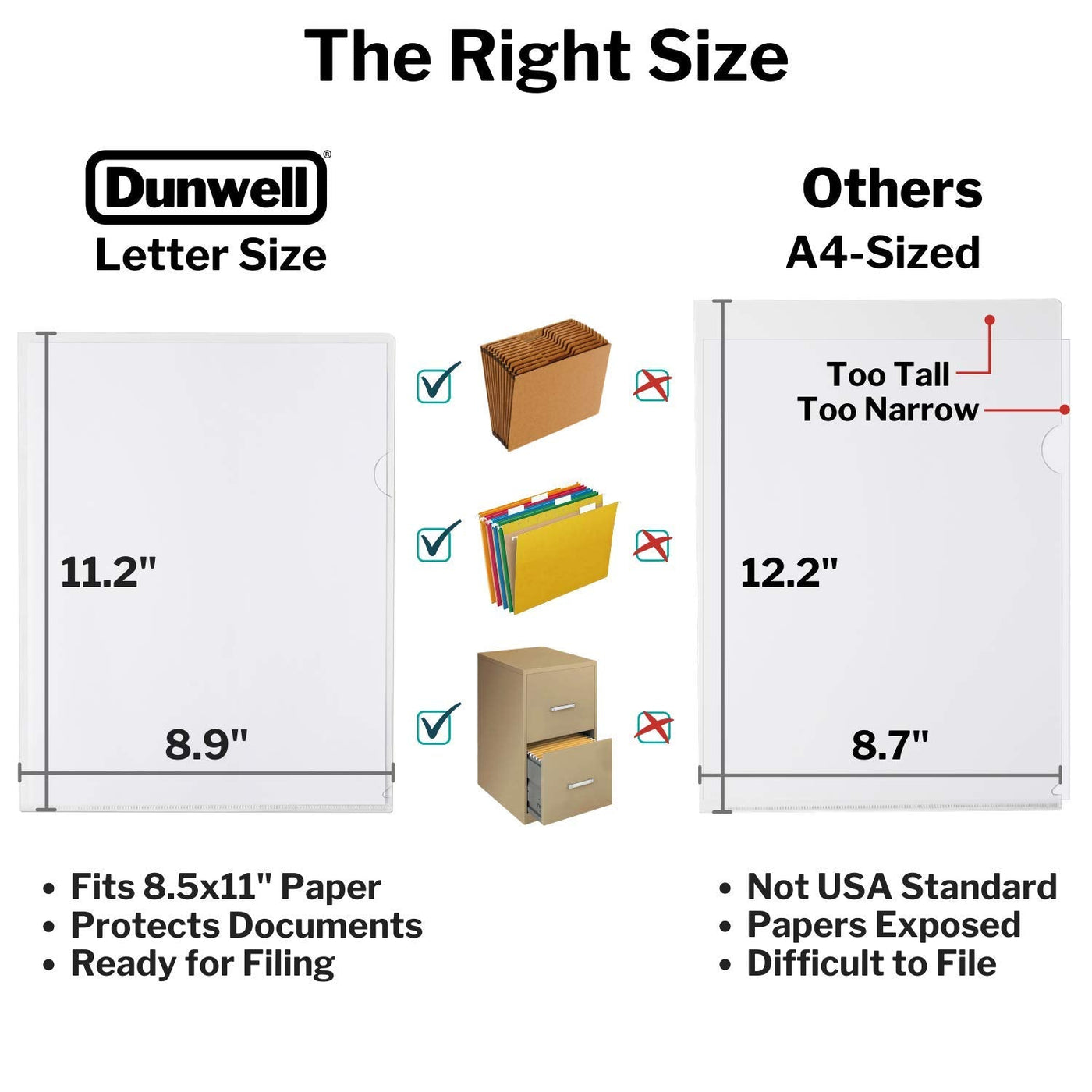 Clear and Color Plastic Document Sleeves Dunwell Transparent Clear and Color Plastic Document Sleeves Dunwell plastic sleeves are a great way to organize your documents and presentations. They are specifically designed for American standard letter size (not A4) paper. Sheet Protector dimensions: 8.9" wide x 11.2" high, to perfectly fit 8.5x11" paper. Each pocket can hold 30 or more sheets, and they work well filed into hanging folders, manila folders, accordion filers, and filing cabinets, to let you easily organize your valued materials. These transparent document pockets let you see through to quickly identify each folder’s contents. A handy thumb notch gives you easy access to the folder’s contents. Other names include Project Pockets, Project Folders, Document Pockets, Document Sleeves, Plastic Sleeves, Document Jackets, Document Folders, Paper Protectors, L-Type Folders, and Presentation Folders. Offered in various pack sizes, in both clear and color, Dunwell Poly Document Sleeves are professionally styled, providing a sleek solution for holding, protecting, and organizing important documents, homework, reports, presentations, tickets, orders, receipts, and more. Dunwell – The Trusted Name in Office Supplies! Clear Document Sleeves Colorful Document Sleeves 2-Pocket Folders with Fasteners 2-Pocket Folders for 3-Ring Binder 3-TAB Filing Folders 2-Pocket Folders Offered Pack Sizes 6 | 12 | 36 Pack 6 | 12 | 36 Pack 6 | 12 | 24 Pack 6 | 12 | 24 Pack 6 | 12 | 24 Pack 6 | 12 | 24 Pack Colors Clear Assorted Colors Assorted | Blue | Black | Red Assorted | Blue | Black | Red Assorted | Blue | Black | Red Assorted | Blue | Black | Red Pockets Single Single Two Two Open Two So Many Uses! Use to organize work documents, kids homework, presentation, loose pages, receipts, coupons, tickets, and more. Offered in various pack sizes, in both clear and color, Dunwell Poly Document Sleeves are professionally styled, providing a sleek solution for holding, protecting, and organizing important papers. The Right Size! (Letter Size, Not A4) Folders are 8.9"(W) x 11.2"(L), sized to fit standard 8.5x11" paper (i.e. USA size, not A4, which is too tall and too narrow). Each pocket can hold 30 sheets. Works with manila folder, hanging folder, accordion filer, filing cabinet. Erasable, Transparent Poly Plastic See-through to easily identify contents, non-PVC, acid-free archival quality, no-copy transfer, no ink lift-off. Flexible, rollable, portable. Won't crack or split. These transparent document pockets let you see through to quickly identify each folder’s contents. A handy thumb notch gives you easy access to the folder’s contents. Dunwell – The Trusted Name in Office Supplies! Read more