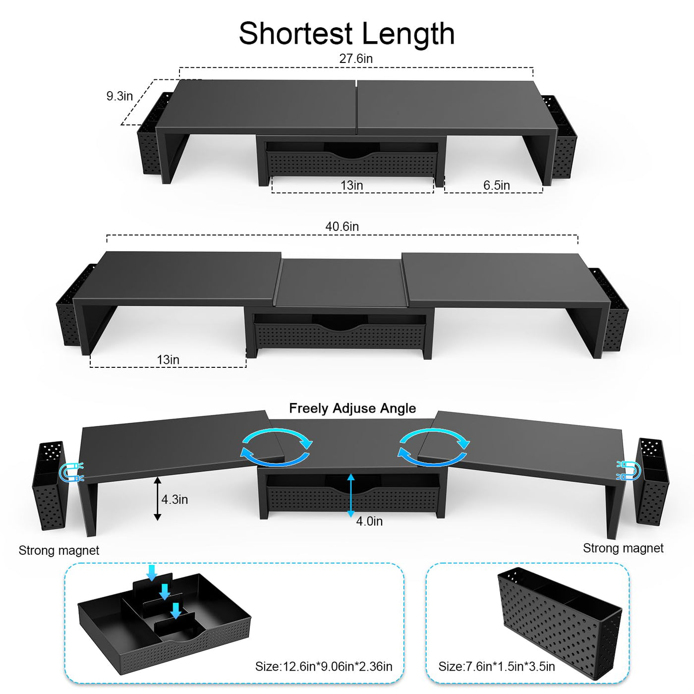 - Ample Storage SpaceThe dual monitor stand features two magnetic pen holders and a drawer, allowing you to easily organize your desk accessories and office supplies, keeping your workspace clear and tidy for easier access.