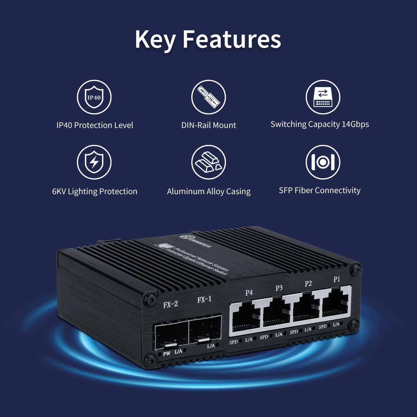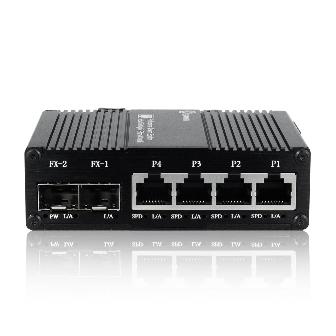 Industrial 6 Port Umanaged Ethernet Switch, Network Switch, 4 Port RJ45 10/100/1000BASE-T+2 Gigabit SFP Slot 1000Base-X, Plug & Play, Din Rail or Wall Mount, AC 110V~220V Wide Voltage Input