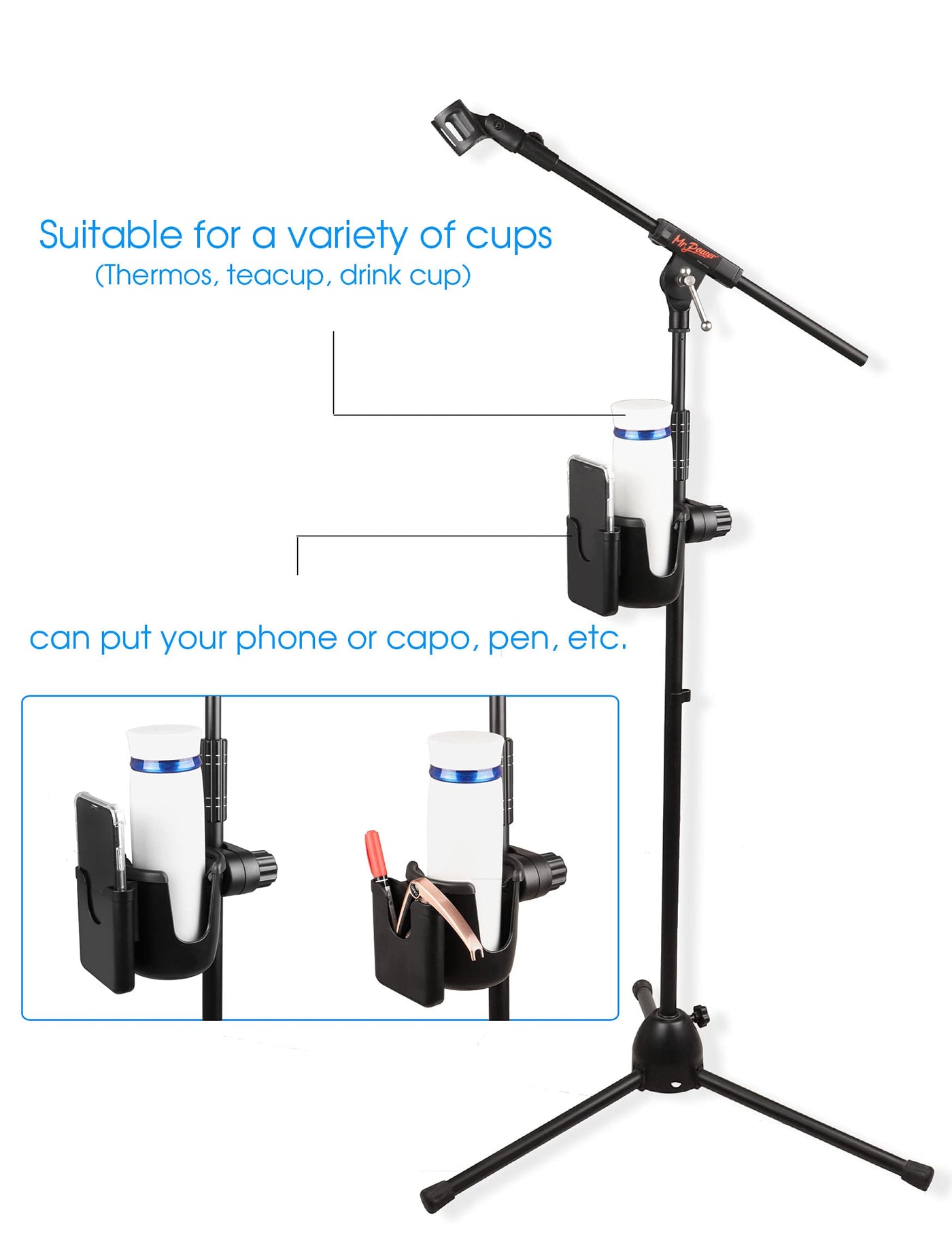 Mr.Power Mic Stand Cup Holder with Phone Holder, Universal 2-in-1 Bottle Holder for Music Stand, Boom