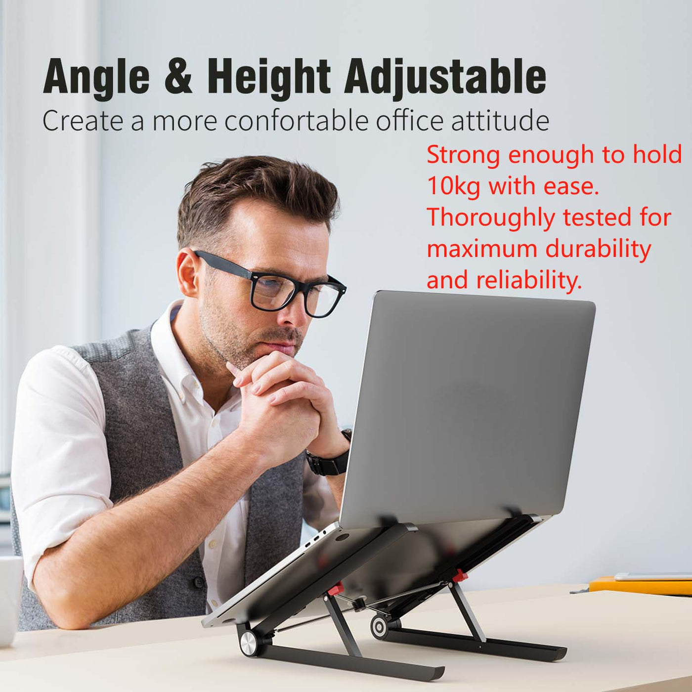 1,Fully and effortlessly handle an 18-inch laptop with great stability, and this is even more true for laptops ranging from 11 to 18 inches. EASY CARRY- ON: Foldable and adjustable laptop stand,just lightweight as 0.6 lbs to make it easy to carry-on. The design of our laptop stand is based on ergonomic principles, aiming to provide the most comfortable experience for users while working on their computers for extended periods without fatigue. After extensive testing, we’ve found that the two most neck-friendly angles for the stand are 26° and 30°. Most stands also feature a tilted design—while the keyboard’s slight incline might take some getting used to, a little practice should make it comfortable. When placed on the stand, the laptop leaves about 3 inches of space underneath the desk, providing room for your phone, glasses, and other small items—it’s really handy! I’ll gather all the suggestions to keep improving our product. If you have any further questions, feel free to reach out—I’ll be happy to assist. Thank you so much, and have a wonderful day!