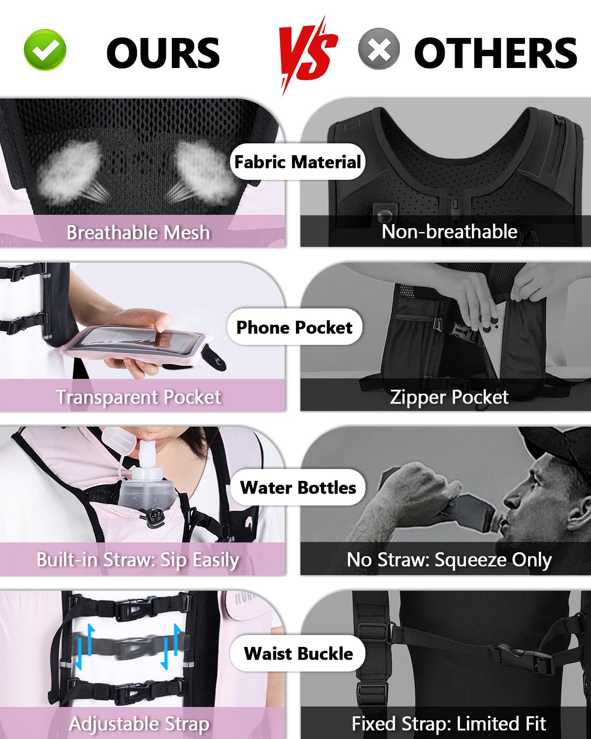 - Hydrate on the Run - Our upgraded running hydration vest comes with a 500ml BPA-free soft flask, now equipped with a convenient straw tip for effortless drinking. No squeezing requiredenjoy smooth, hands-free hydration so you can stay focused on your run. The elastic drawstring keeps the flask securely in place to prevent bouncing, making it ideal for marathons, trail running, and long-distance adventures.