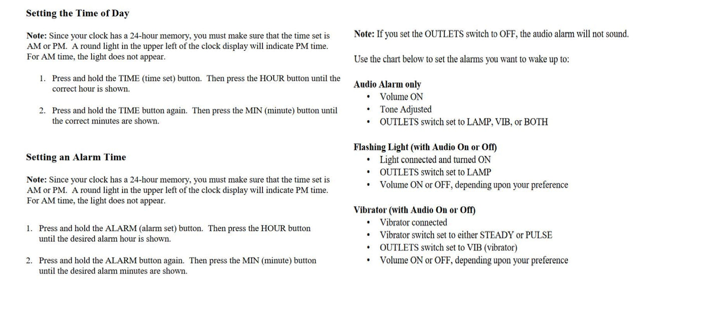 - EASY TO USE - Simple clearly labeled alarm settings. Turn knobs to set volume and tone. Easy switches and button to control multiple alarms, dimmer, snooze, and clock. Place on desk or night table for easy access