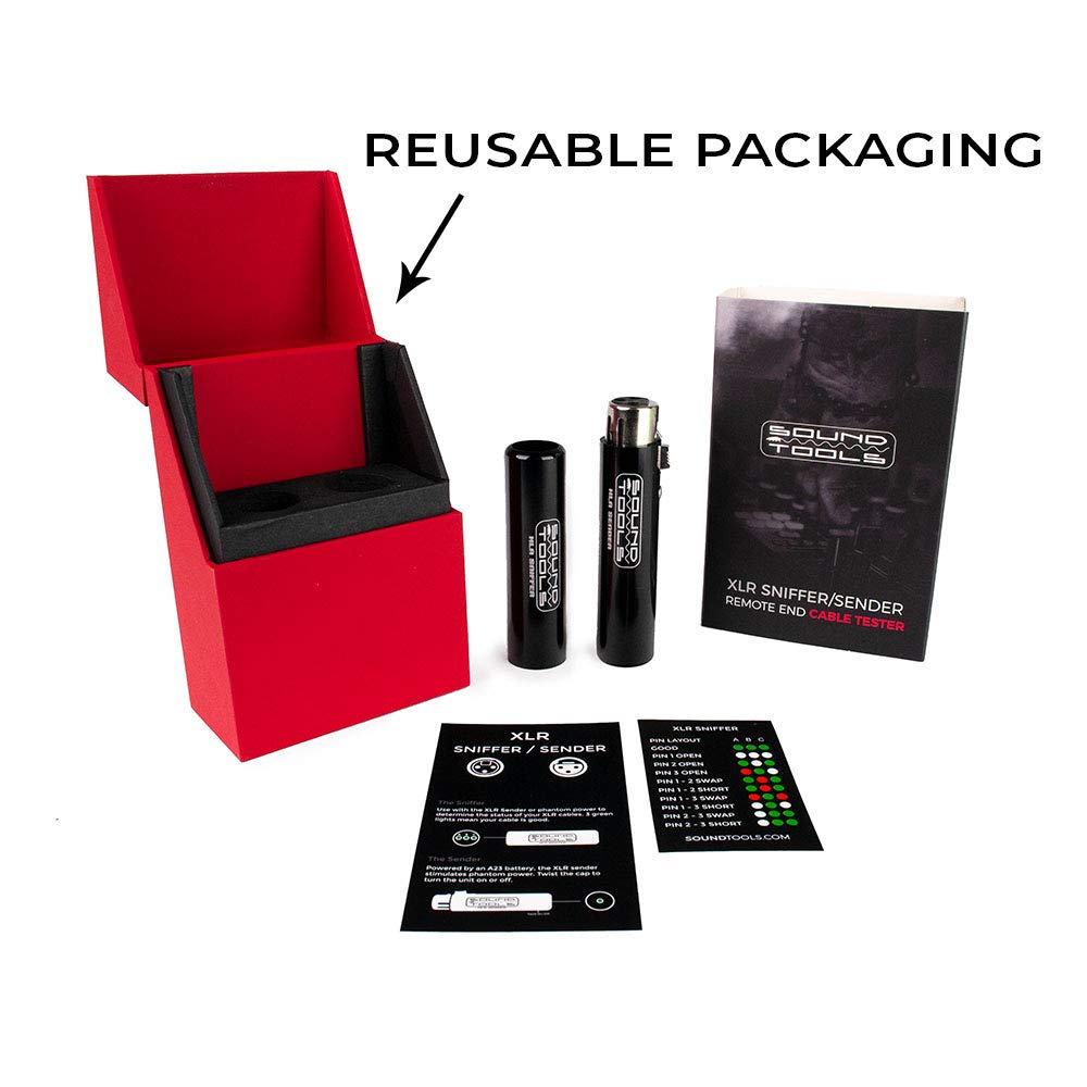 “Isn’t there an easier way to do this?” That’s the question that leads to every SoundTools product. For the XLR Sniffer/Sender, Dave Rat of RAT Sound Systems asked that question about issues he had with the lead mic before a Rage Against the Machine show in 1996. After a nightmare night of trial-and- error and back-and-forth calls before fixing the issue, Dave realized that there had to be a better tool to help troubleshoot mic line issues. The XLR Sniffer/Sender is that better tool. Road-tested in the world’s toughest festival tour environments (and run over with a car, just for kicks), the XLR Sniffer Sender can take an absolute beating and still survive to get you through the next show. When you need to know quickly whether it’s the mic or the line, the XLR Sniffer/Sender duo will give you an instant result. Test 50+ channels from a snake system in minutes with the Sniffer unit using phantom power from the console, or use the Sender unit to provide phantom power when needed. The Sniffer unit has 3 LED lights. When attached to an XLR cable that is powered by a phantom power source (either a console or the Sender unit), the Sniffer will light up in either green or red LEDs to show whether the line is good (all green) or has errors (all red or a combination of red and green). The XLR Sniffer Sender can even test for a pin 2-3 short. Every unit comes in a sturdy, reusable box with a sticker guide defining the LED readout.